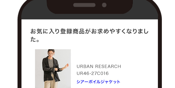 お気に入り商品が値下げされたり、在庫がわずかになった際にお知らせメールが届きます。