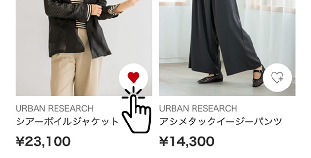 商品ページや検索結果ページに表示されているハートマークを押すと、「お気に入り」に登録されます。