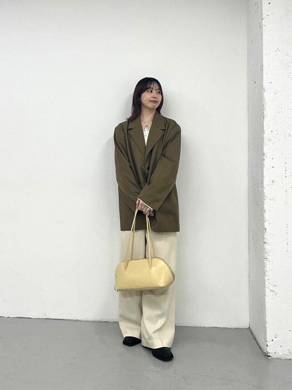 ヴィンテージのような光沢と質感が特徴のヴィーガンレザーを使用。ラウンドボディーに細いハンドルがエレガンス感を与え、オンオフどちらでも使用できるアイテムとなっています。