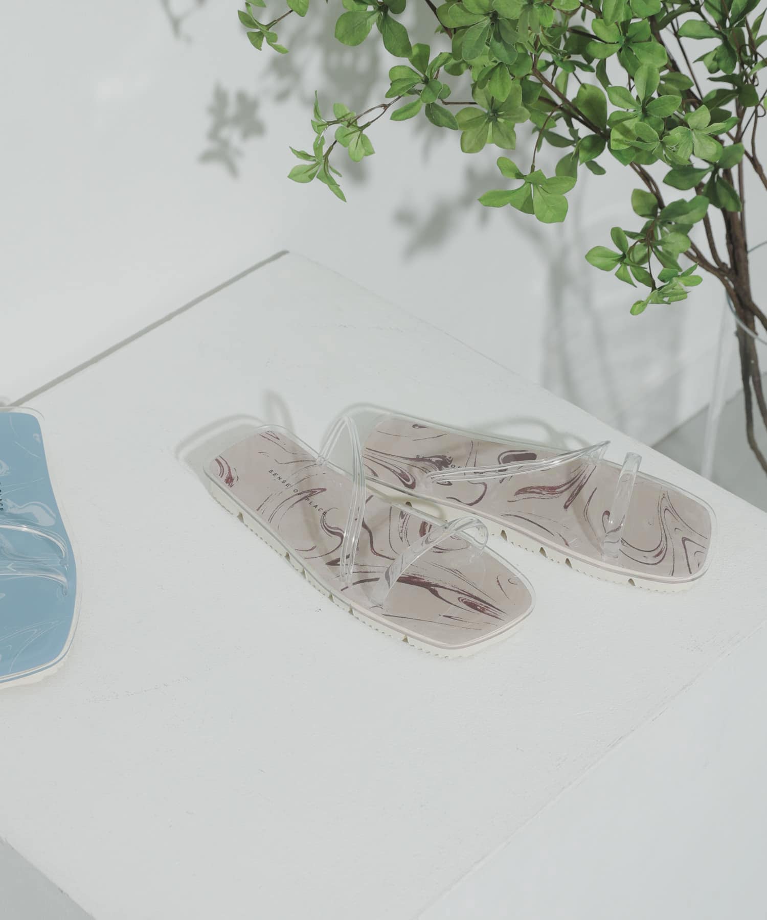 オリジナルのマーブル柄をプリントした抜け感たっぷりなクリアサンダル
