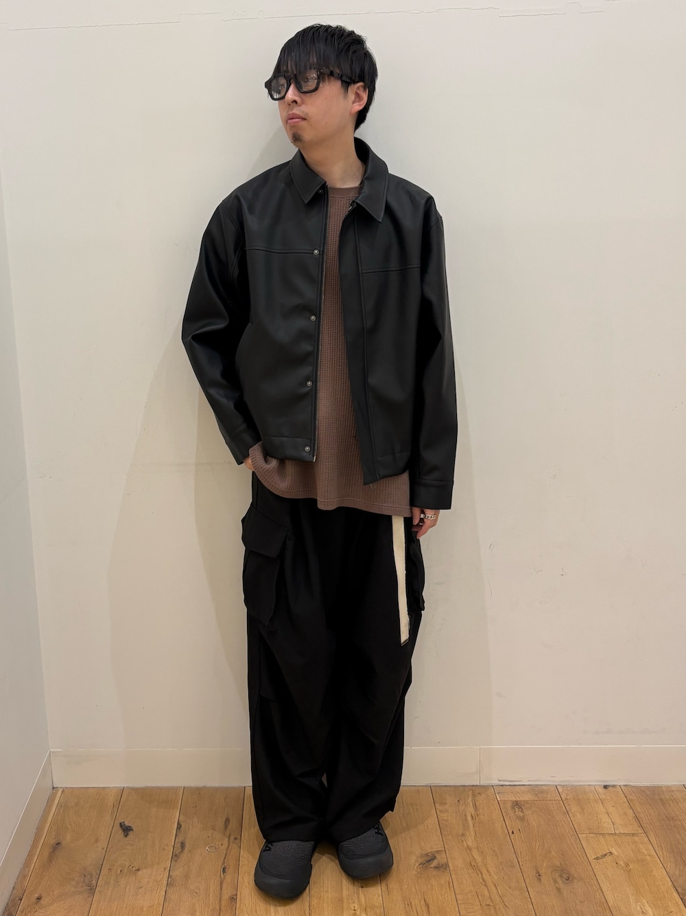 スエード調のジップブルゾンと合わせた、素材のコントラストを楽しむクリーンなミリタリースタイルがおすすめです。トップスにはVネックの起毛プルオーバーやシンプルなクルーネックニットを合わせることで、パンツのボリューム感を活かした旬なバランスに。足元はボリュームスニーカーでアクティブにまとめても、レザーシューズできれいめに引き締めてもサマになります。
