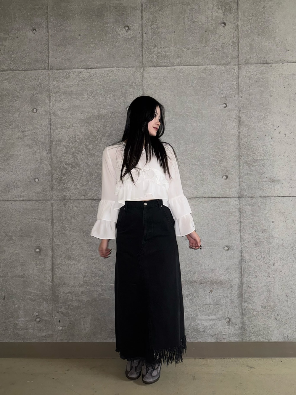 ・裾にあしらった贅沢なフリルがポイント。甘くなりすぎないよう絶妙なボリュームに調整