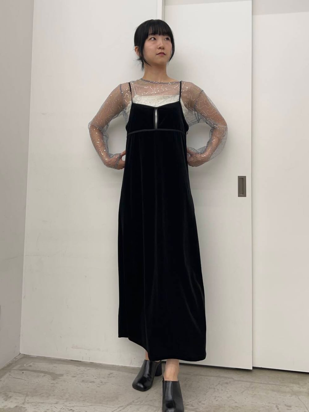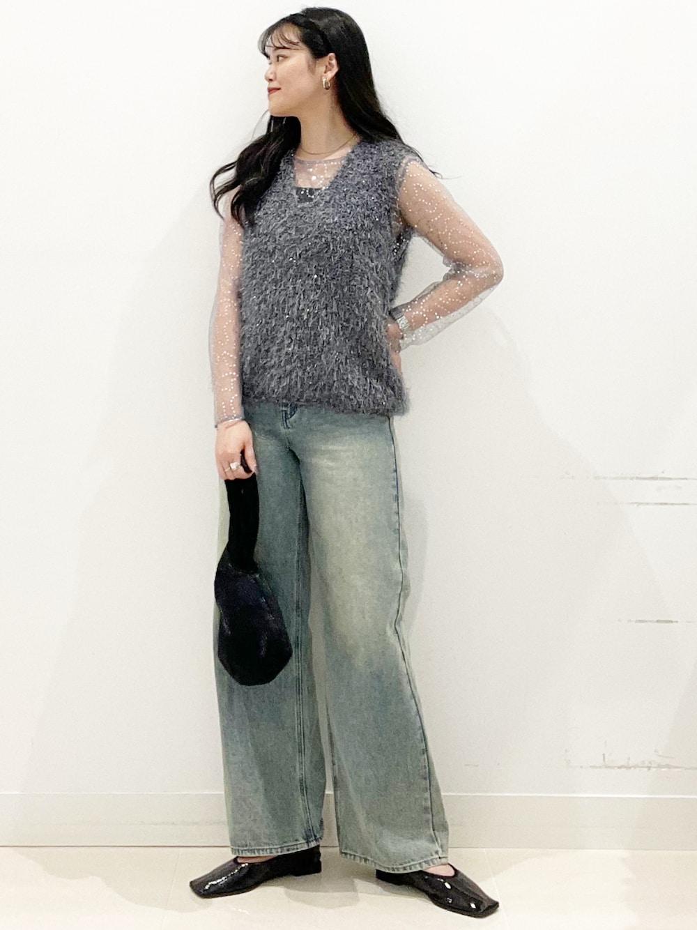 ジレの中やジャケット、ジャンパーワンピースなど様々なアイテムとレイヤードするのにバランスがいいトップスです。冬はニットやスウェットの中に着て裾や袖口からスパンコールをのぞかせるとまた違った印象になりオススメです。