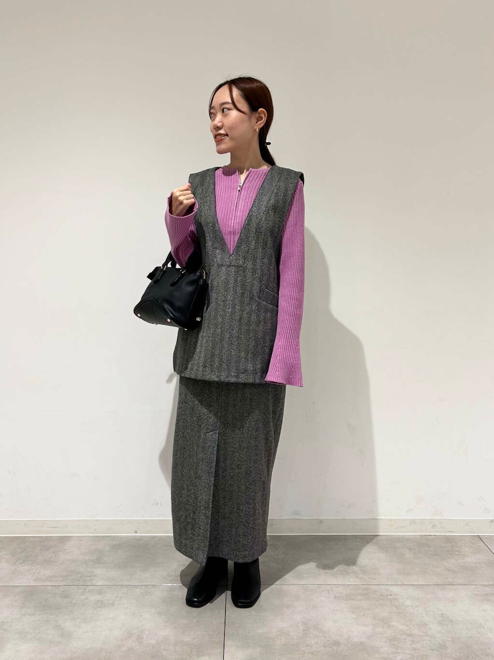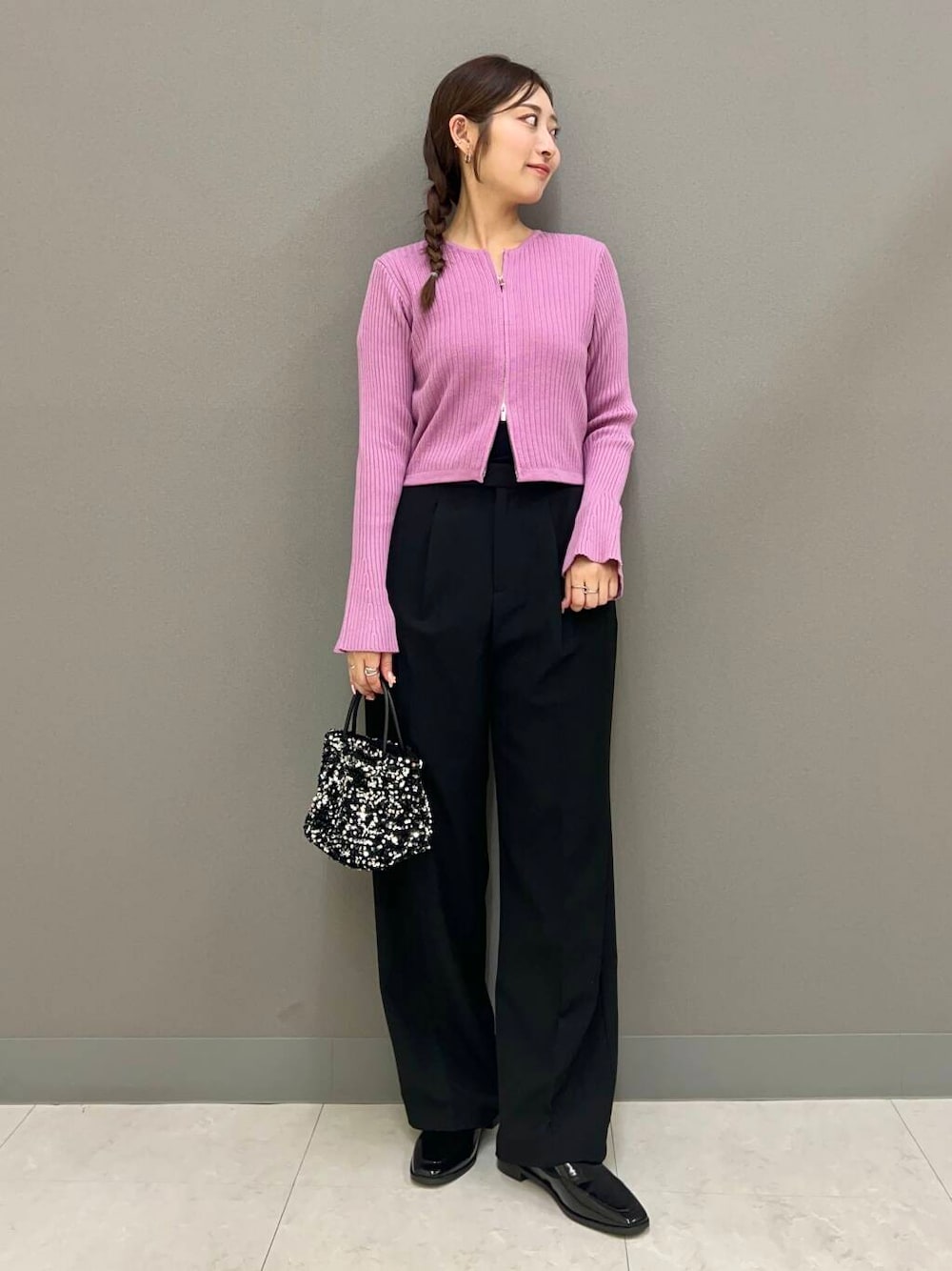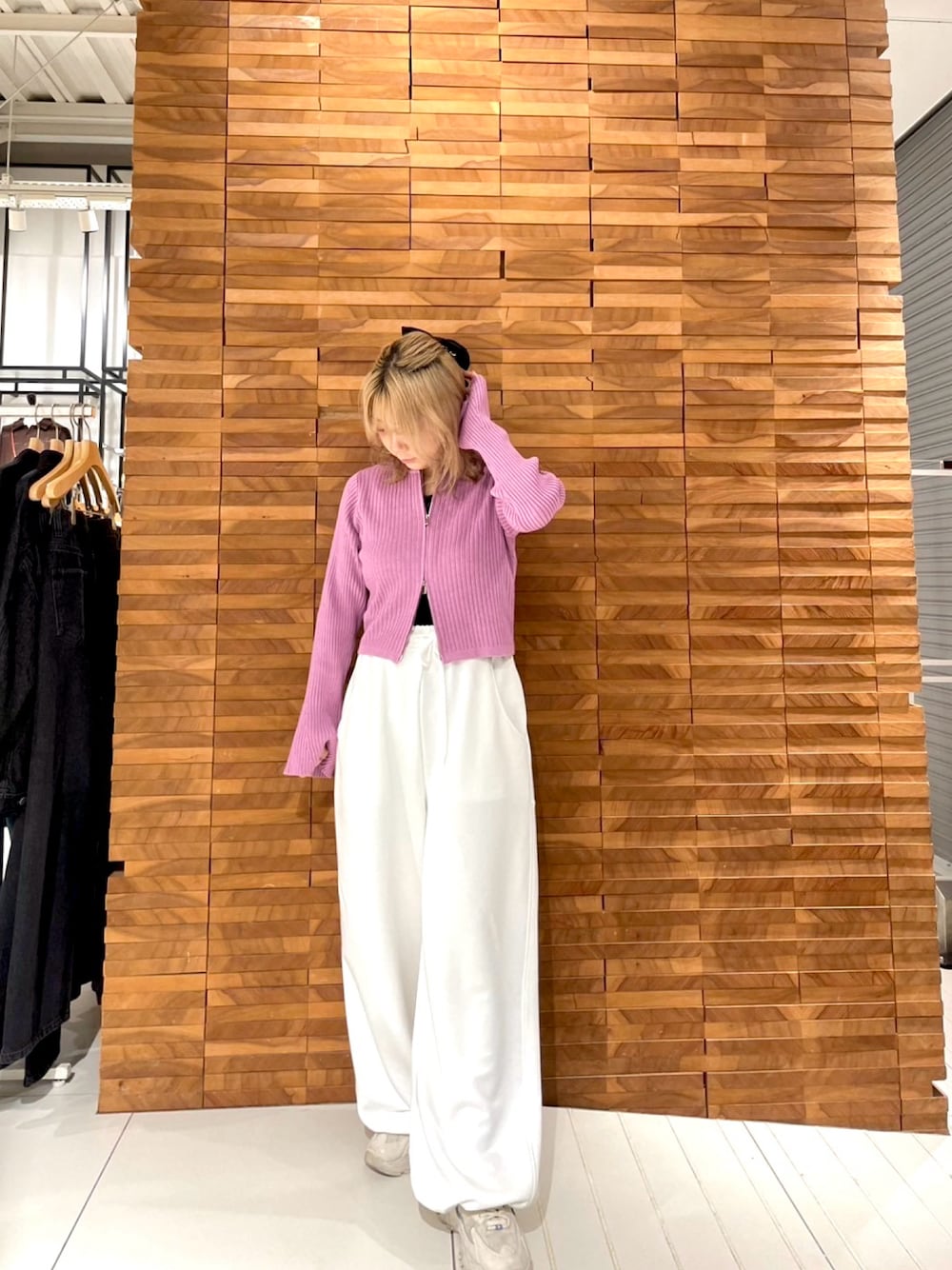 今期大注目のジップニットは、上からも下からもジップが開けれる仕様になっているので、お好みのバランス感で着用頂けます。今期はワイドパンツ合わせがおすすめ。