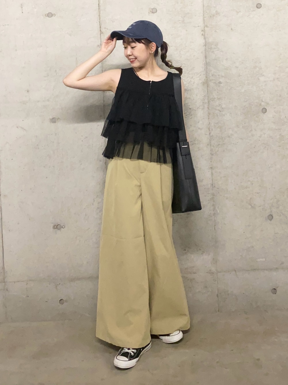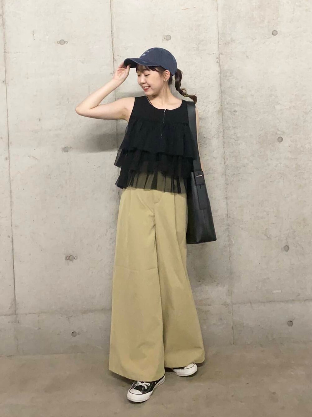 コンパクトなトップスと合わせて、後ろのベルトをギュッと絞って着こなすのがおすすめ!