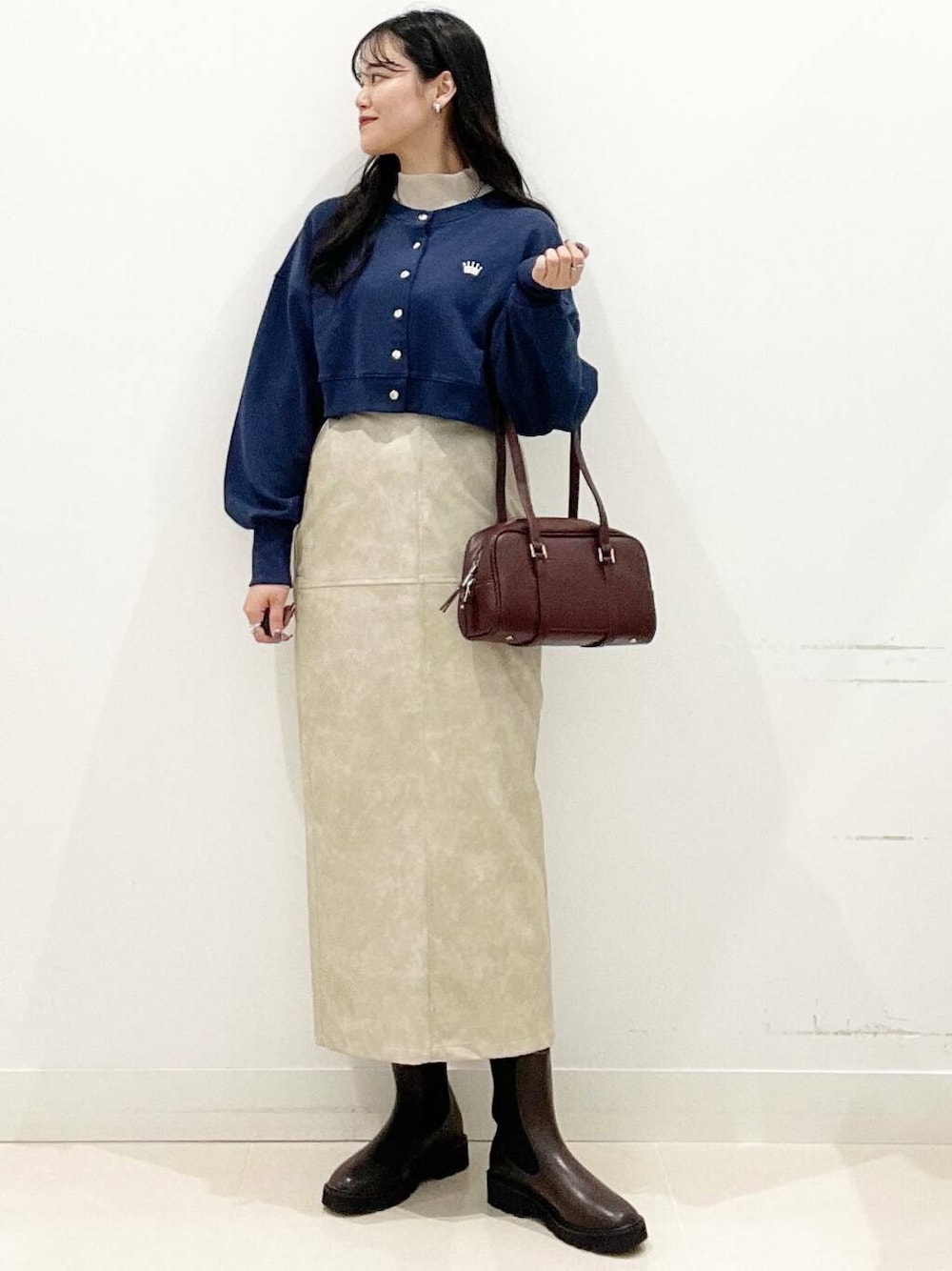 シーズンムード高まる素材感が素敵なレザースカートはシャツ+ビスチェでトレンドスタイルもよし、コンパクトニットなどで綺麗めにもきていただけオンオフ着回しのきくアイテムです。切替デザインがヒップ周りに入っておりスタイルアップが叶います。