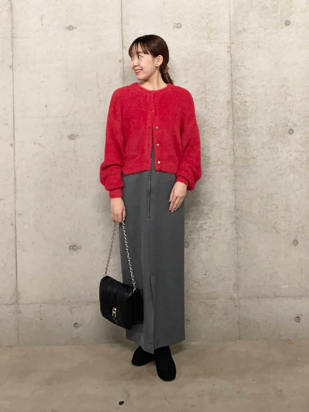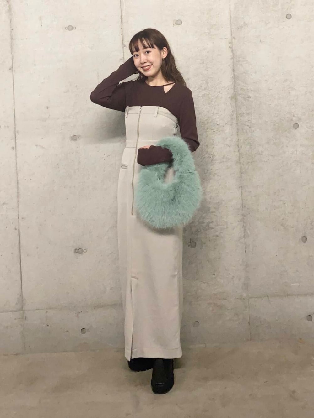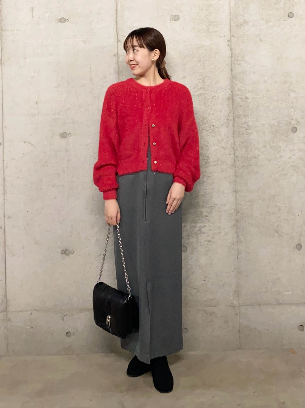 トレンドのベアデザインアイテムは綺麗めの素材でオンオフ着用いただけます。タンク合わせ→シアーインナー→カーデ→上からばさっとニットをかぶるスタイリングでまだ暑い持期から冬まで長く着用いただけます。
