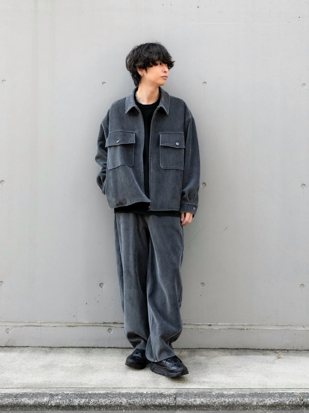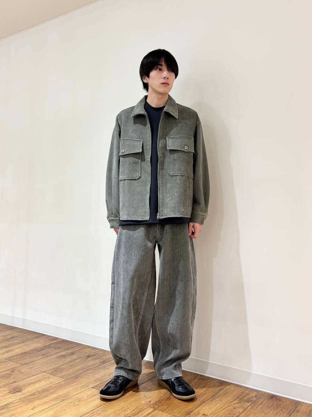 AA47-17S109 ヴィンテージツイルZIPブルゾンとセットアップで着用していただけます。カジュアルなトップスとの相性がよく、トレンドのグランパコアスタイルやヴィンテージスタイルにマッチする一本です。