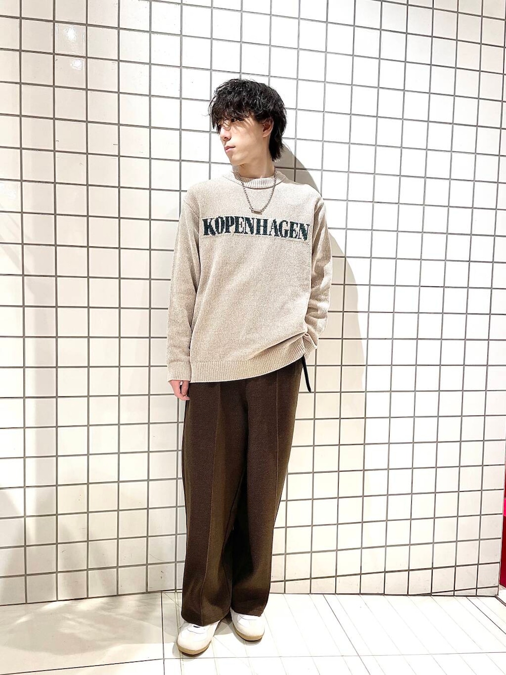 センタープレスありのきれいめパンツですが、カジュアルなスウェットやニットと合わせても引き締め役として重宝します。ハイゲージニットをタックインしたスタイリングもおすすめです。