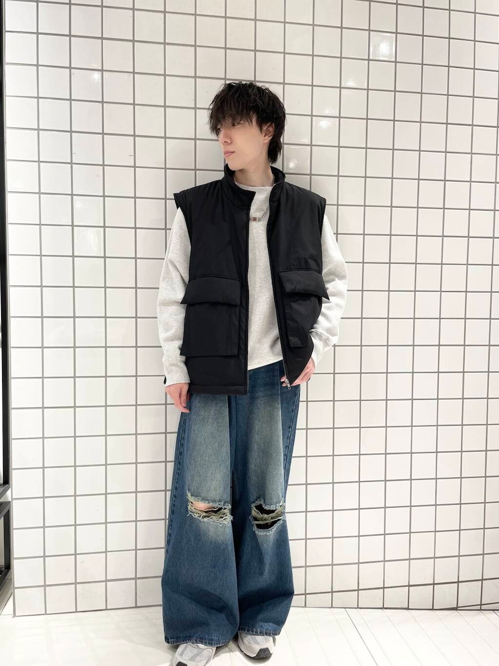 秋の季節にはシャツやスウェットの上に合わせるプラスワンアイテムとして、冬場はウールコートの上やレザージャケットの上のレイヤードアイテムとして活躍します。やや長めの着丈なのでワイドパンツとの相性が抜群です。
