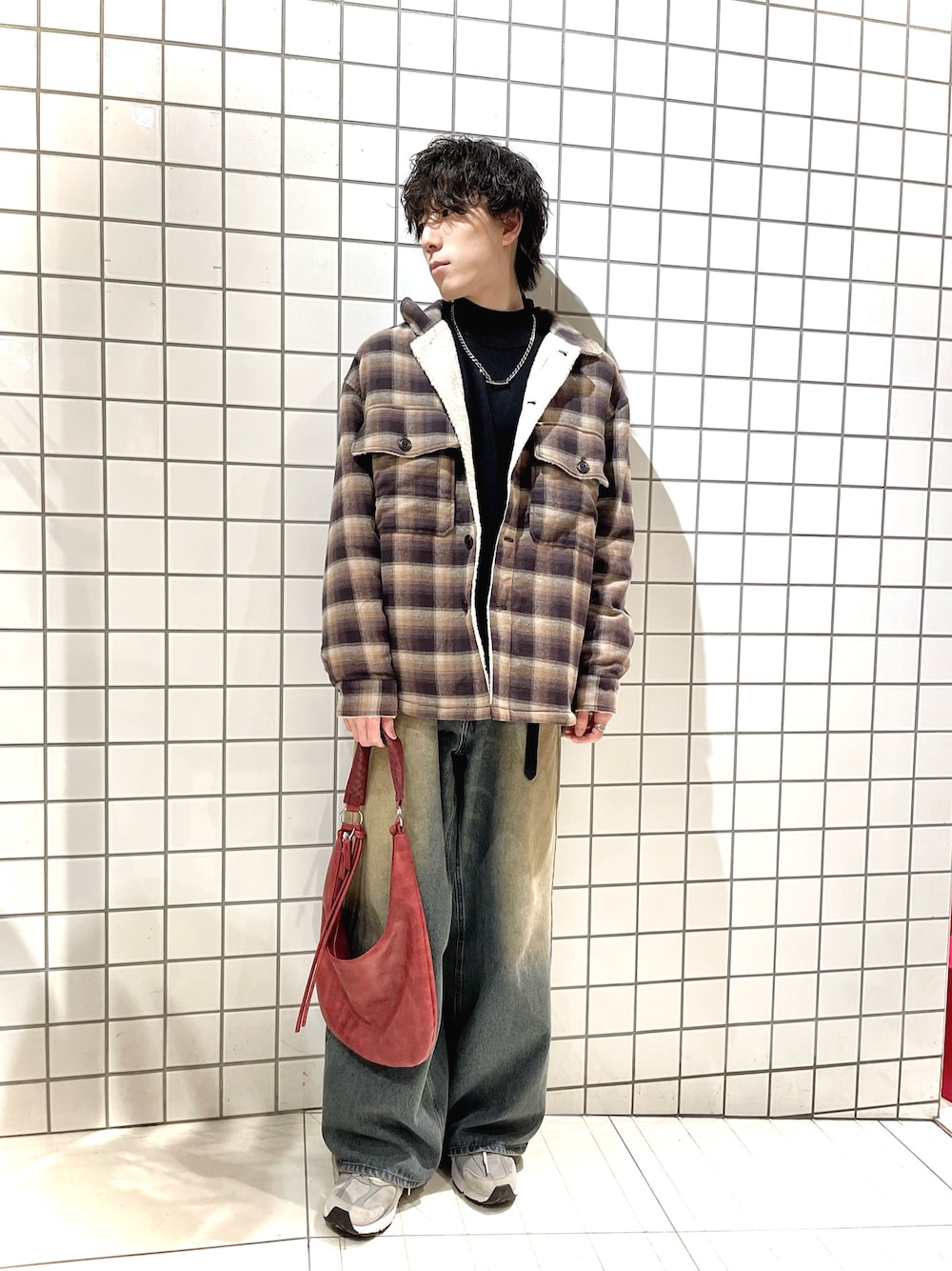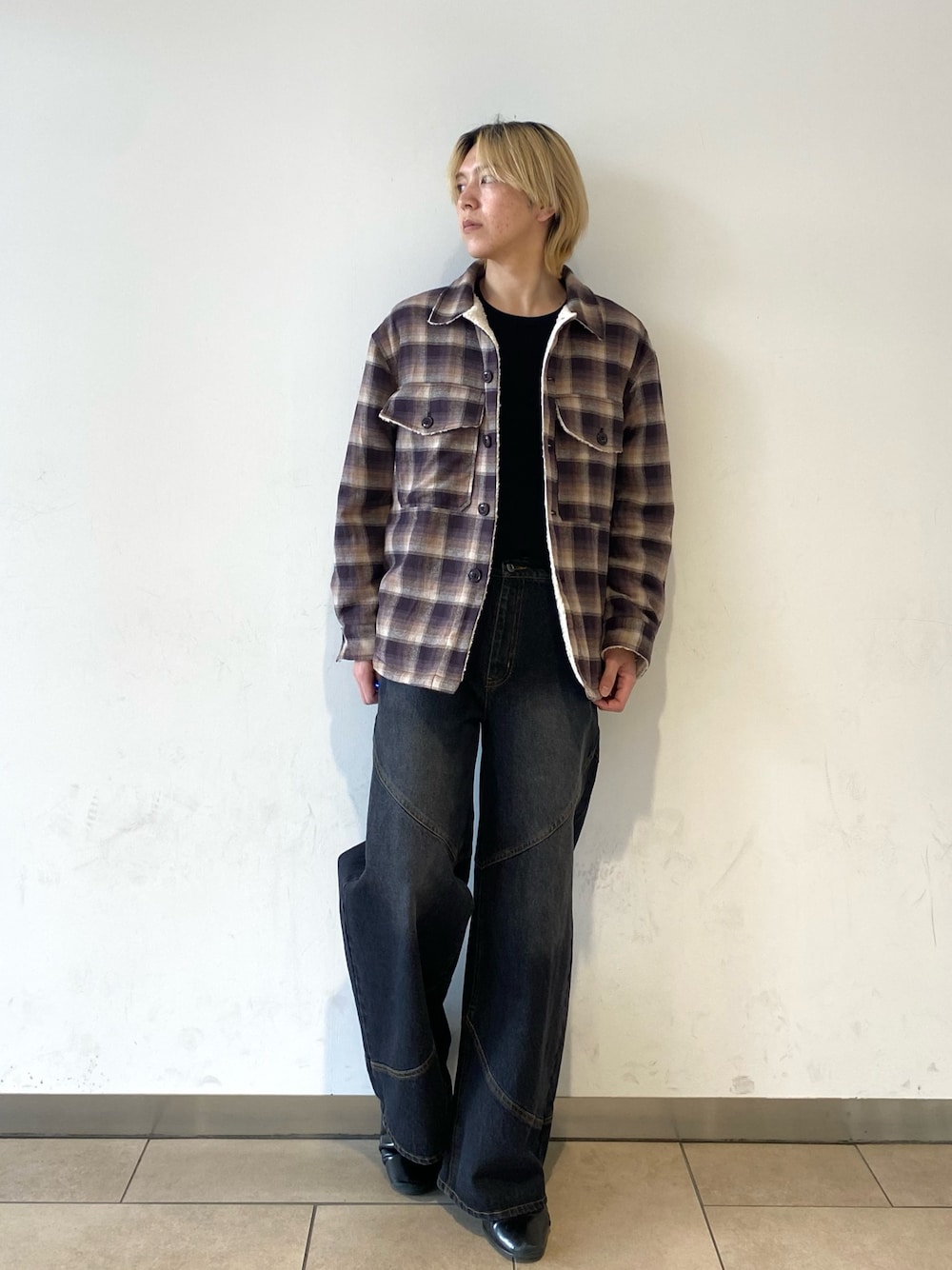 〇起毛したオンブレチェックの表地に裏ボアをあしらいあたたかく