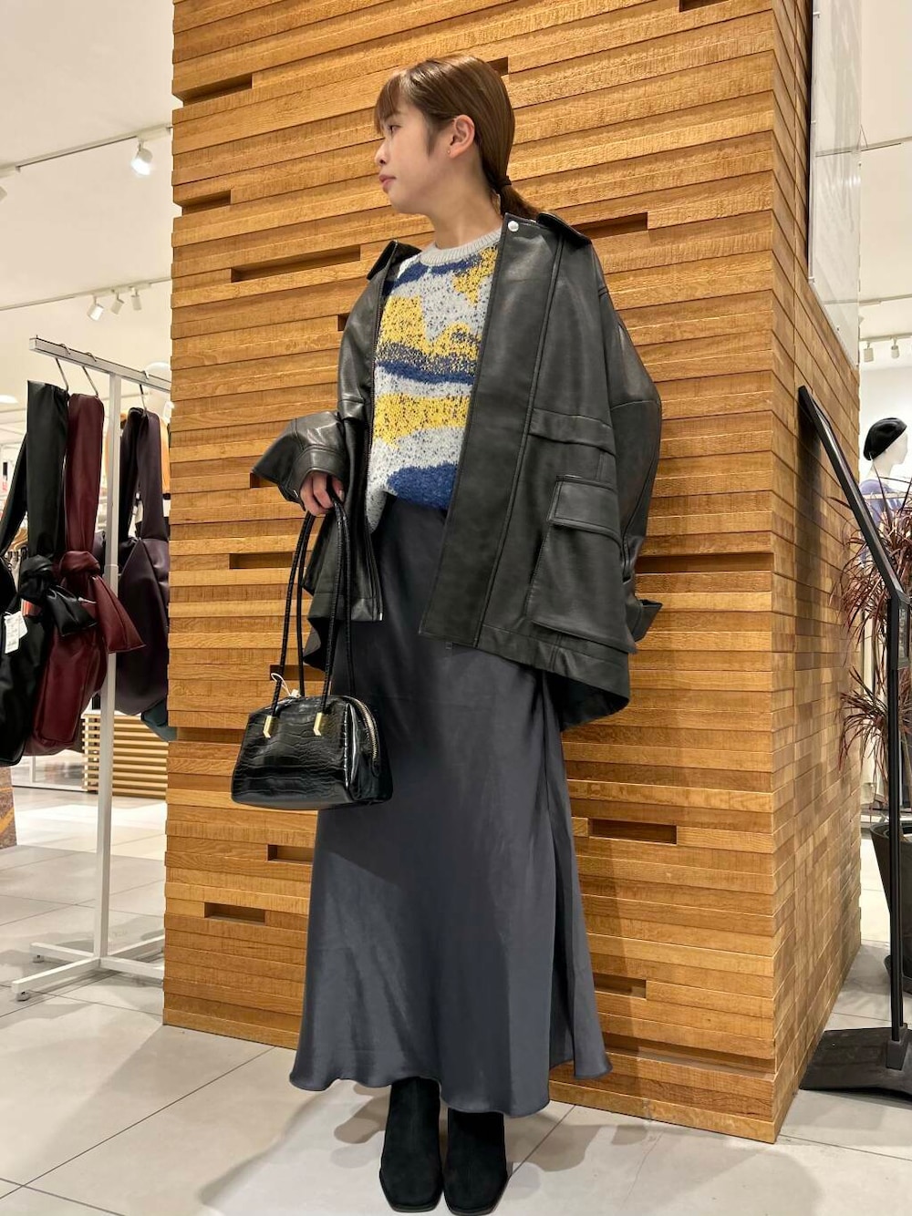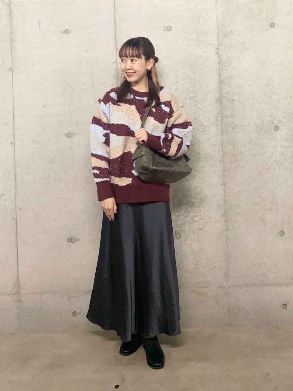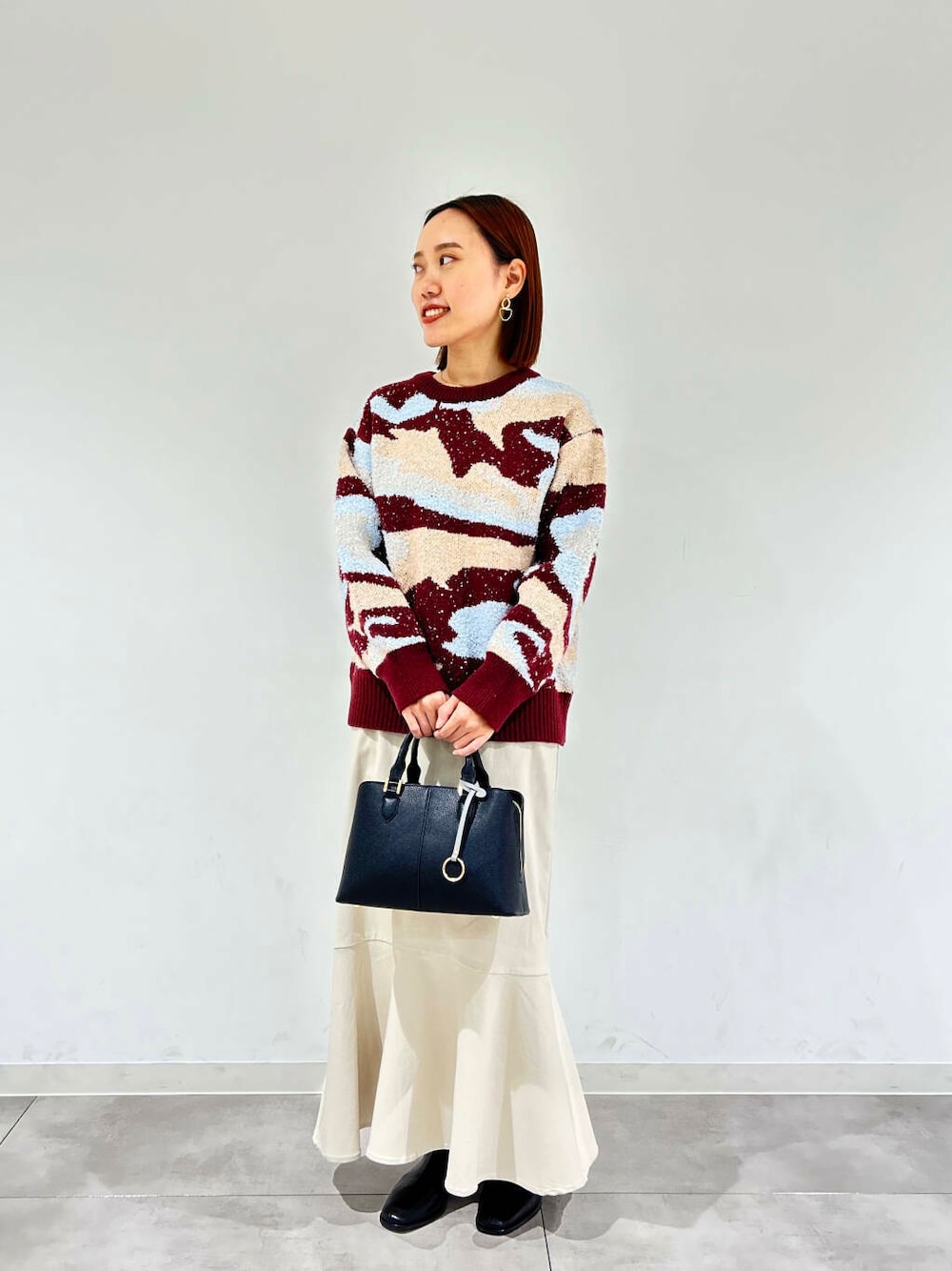 ニット自体が目を惹く主役級なのでボトムはシンプルにデニムや無地のスカートを合わせ、是非ニットを目立たせて着用していただきたいです。