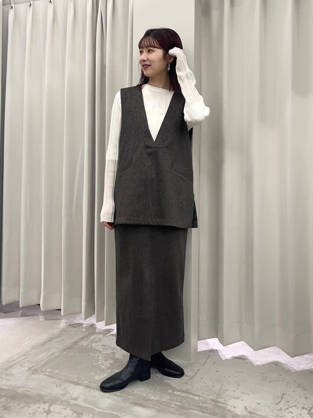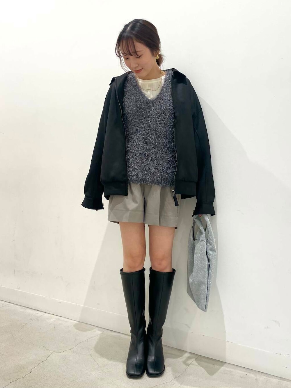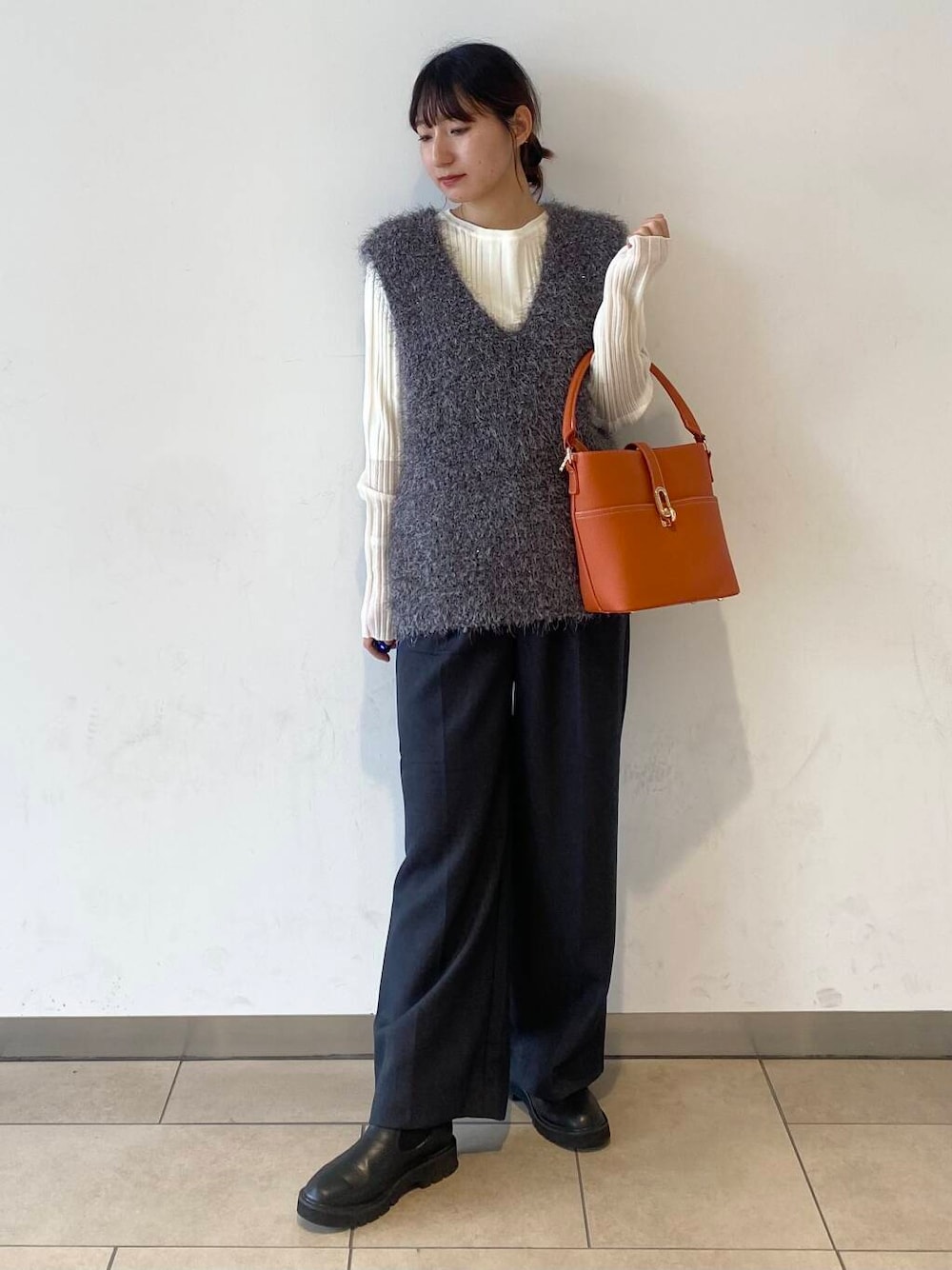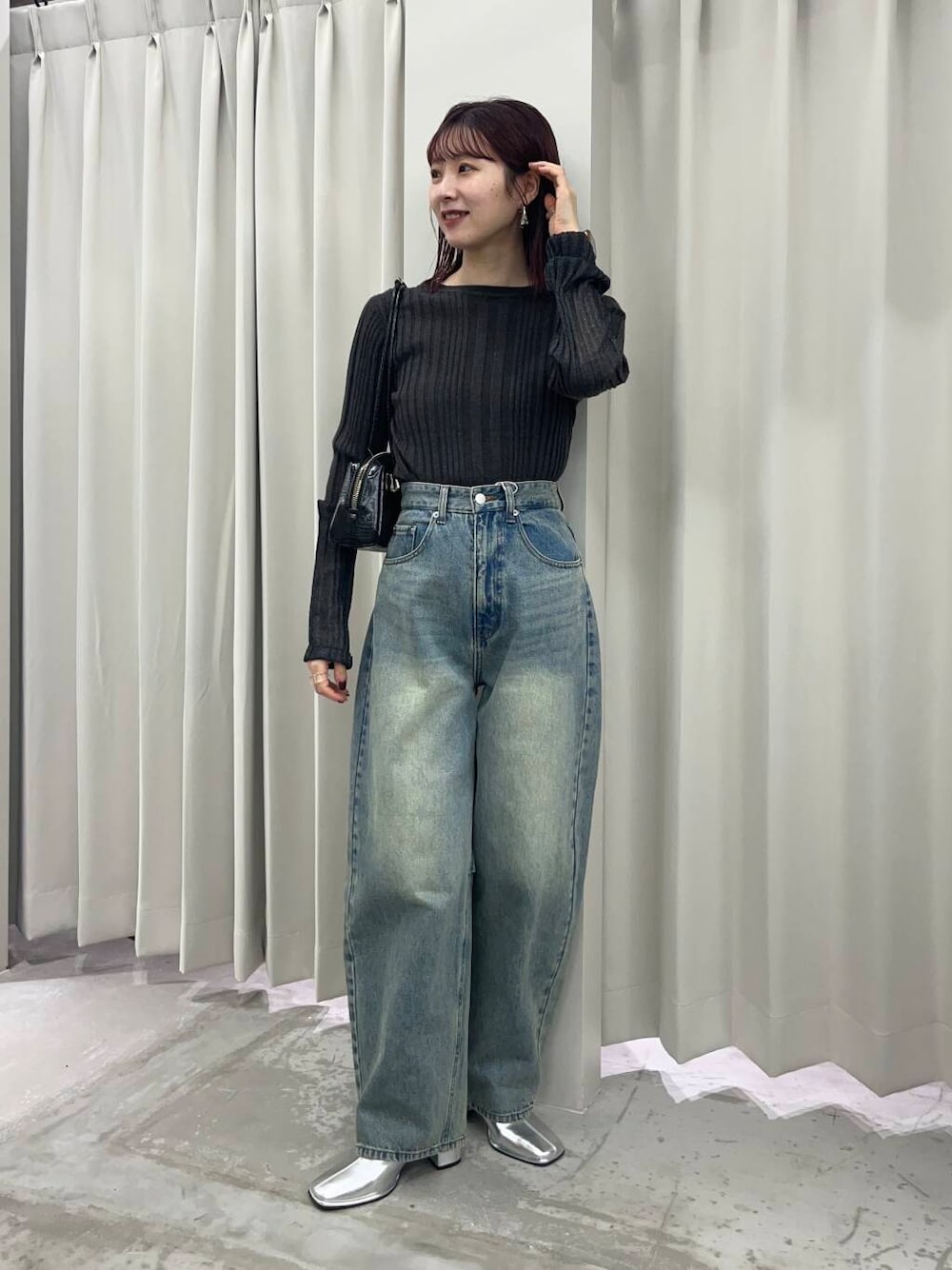 形はシンプルなので、ボトムを選ばず使いやすいニット。ルーズなカーディガンやスウェットのインナーに仕込んで、シアー部分の袖口を見せるのも素敵です。