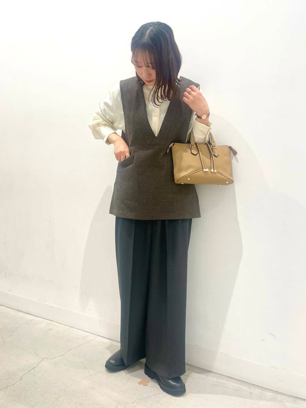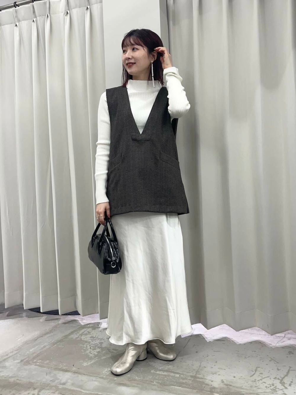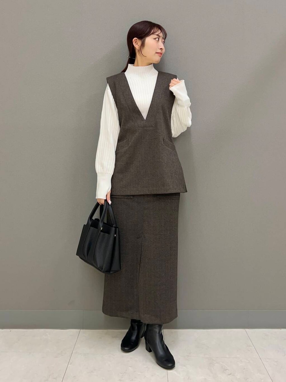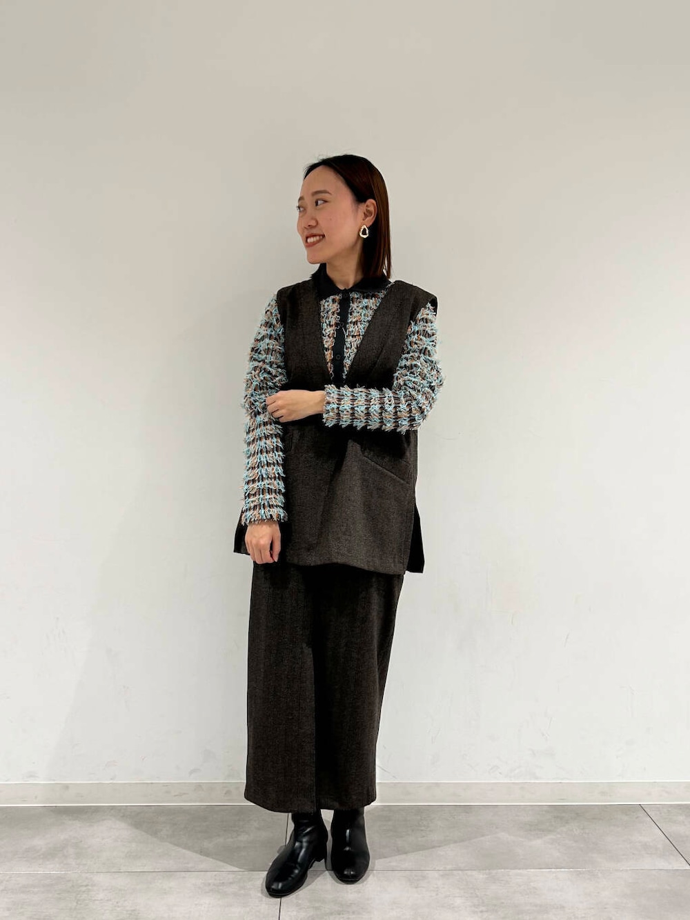 ブラウスやロングスリーブTシャツなどとのレイヤードスタイルに取り入れやすいプルオーバータイプのジレ。セットアップのスカートと合わせれば、ジャンスカのような着こなしに。
