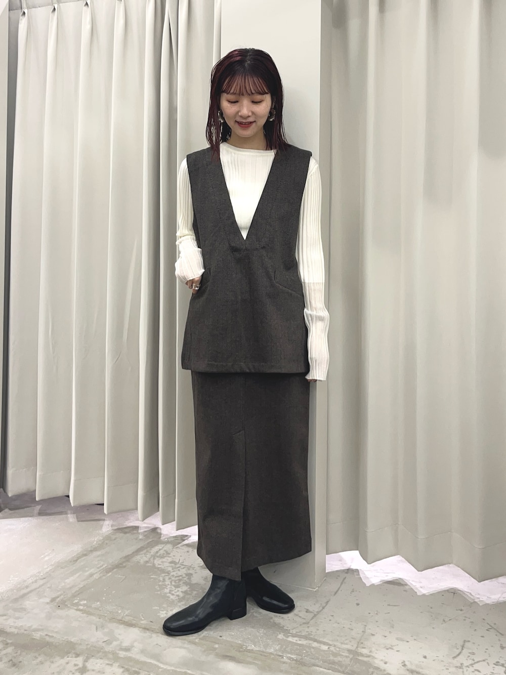 ブラウスやロングスリーブTシャツなどとのレイヤードスタイルに取り入れやすいプルオーバータイプのジレ。セットアップのスカートと合わせれば、ジャンスカのような着こなしに。