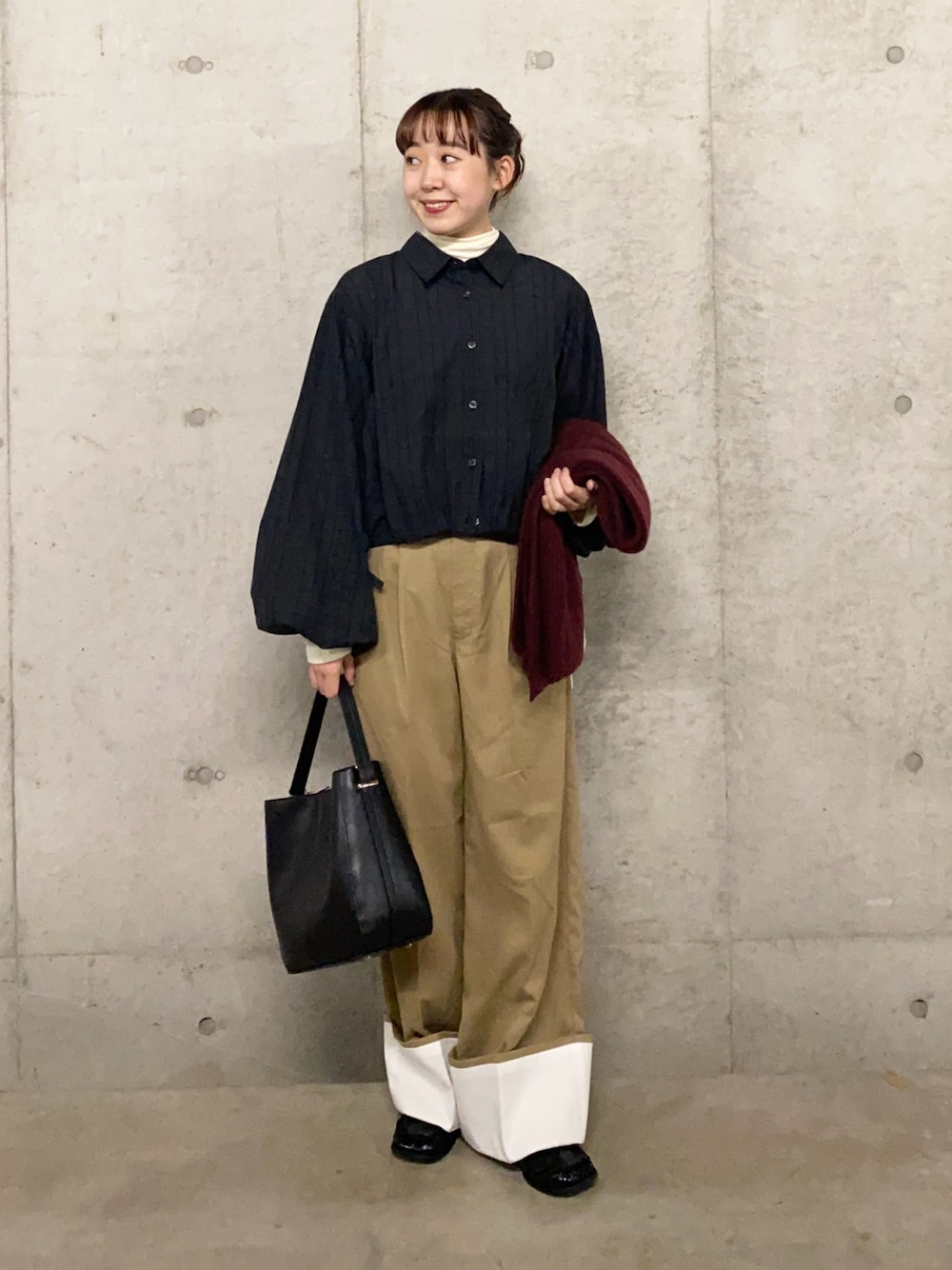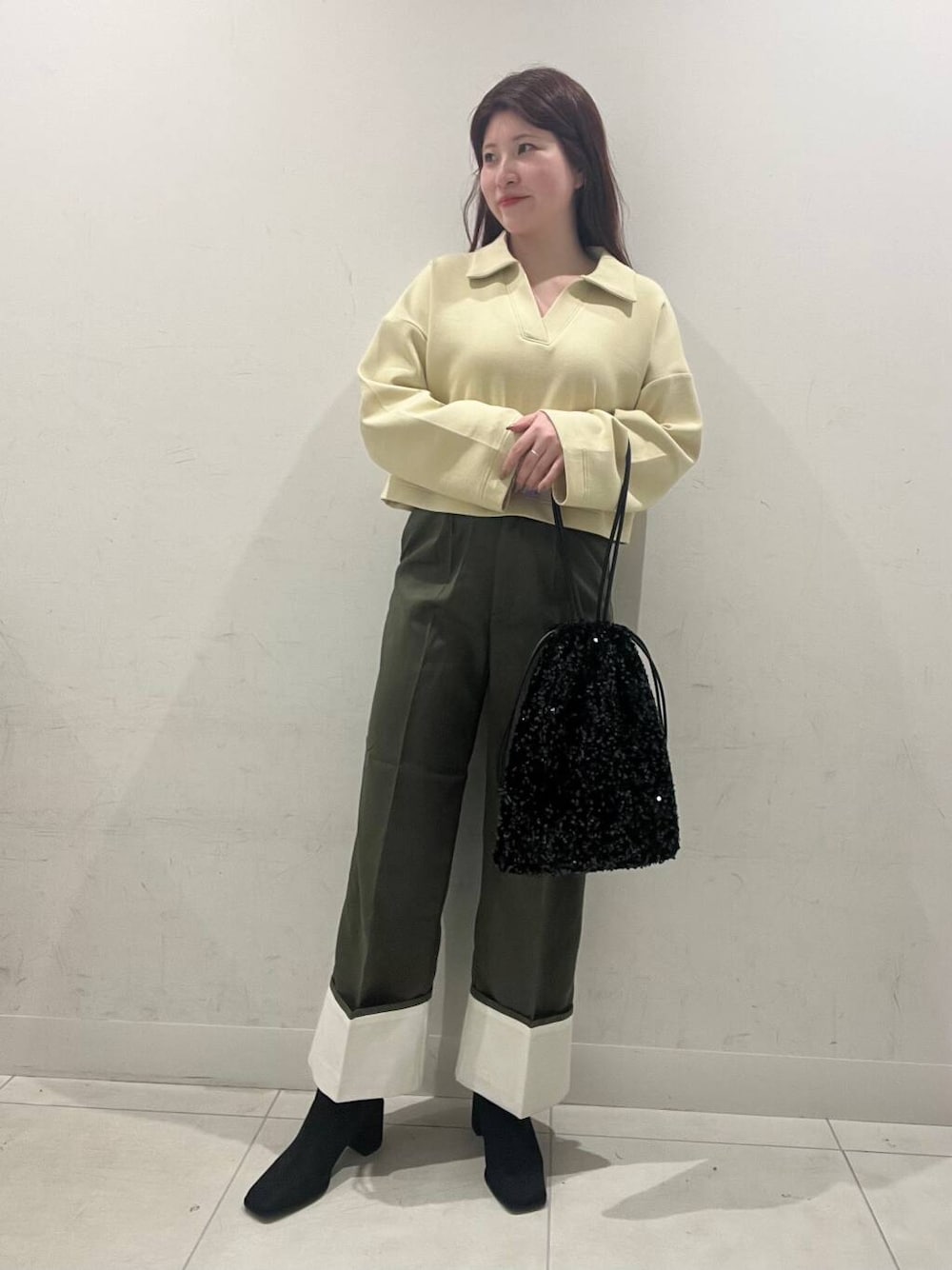 ターンバックデザインが目を引くパンツは組み合わせが広がる万能アイテム。脚長効果も出来るシルエットで、ボリューム感のあるニットとの相性も抜群です〇