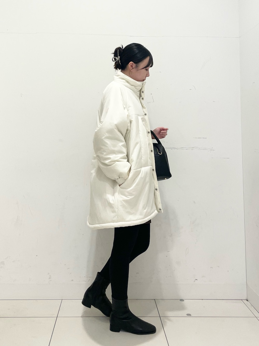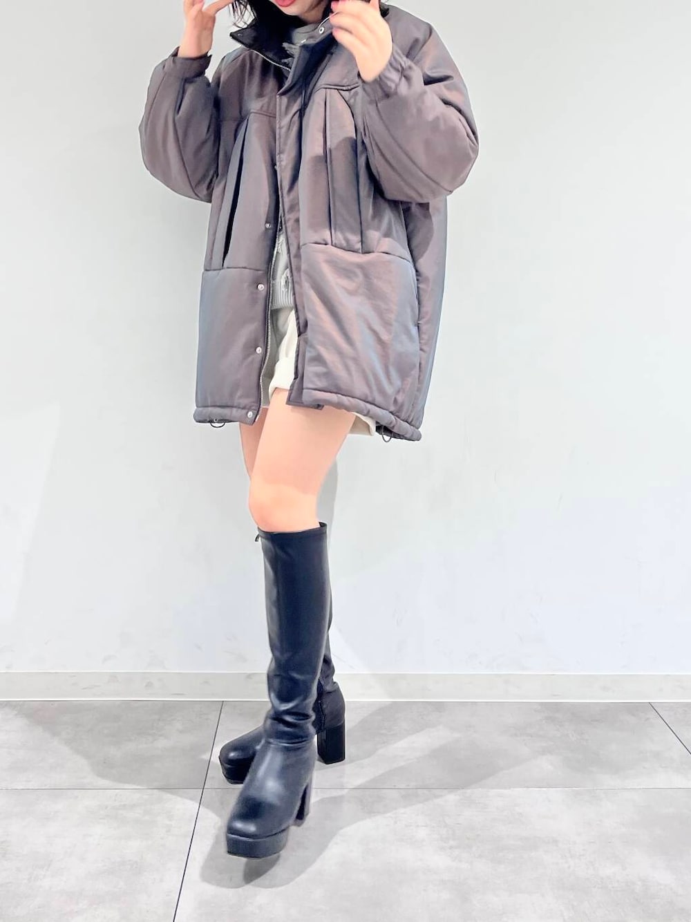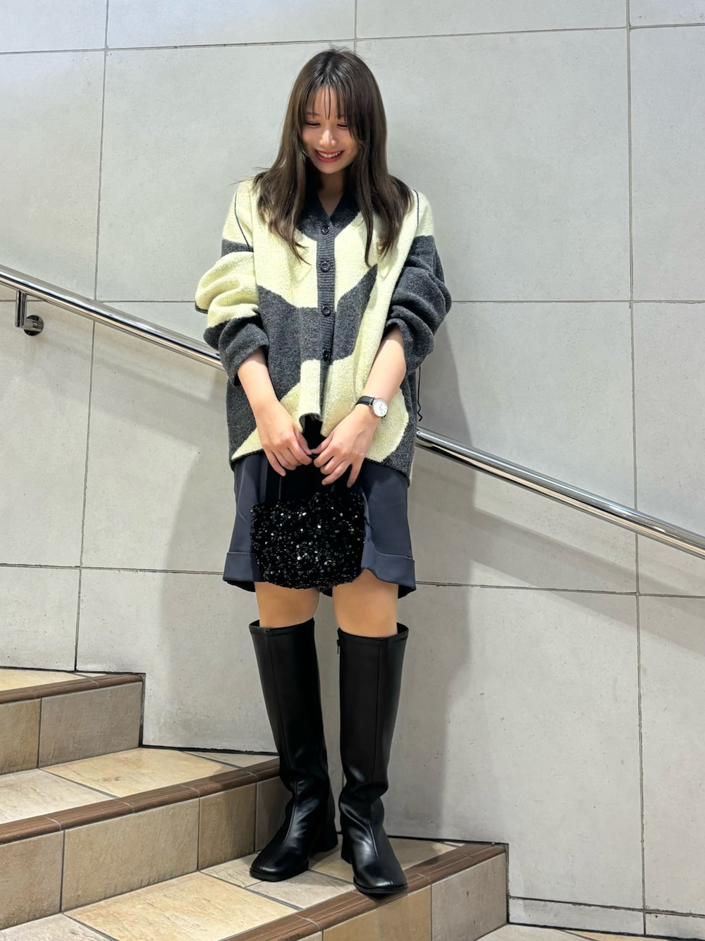 ルーズなニットに合わせて足元に抜け感を出すスタイルがおすすめ。お気に入りのブーツと合わせてトレンドのミニボトムに挑戦!