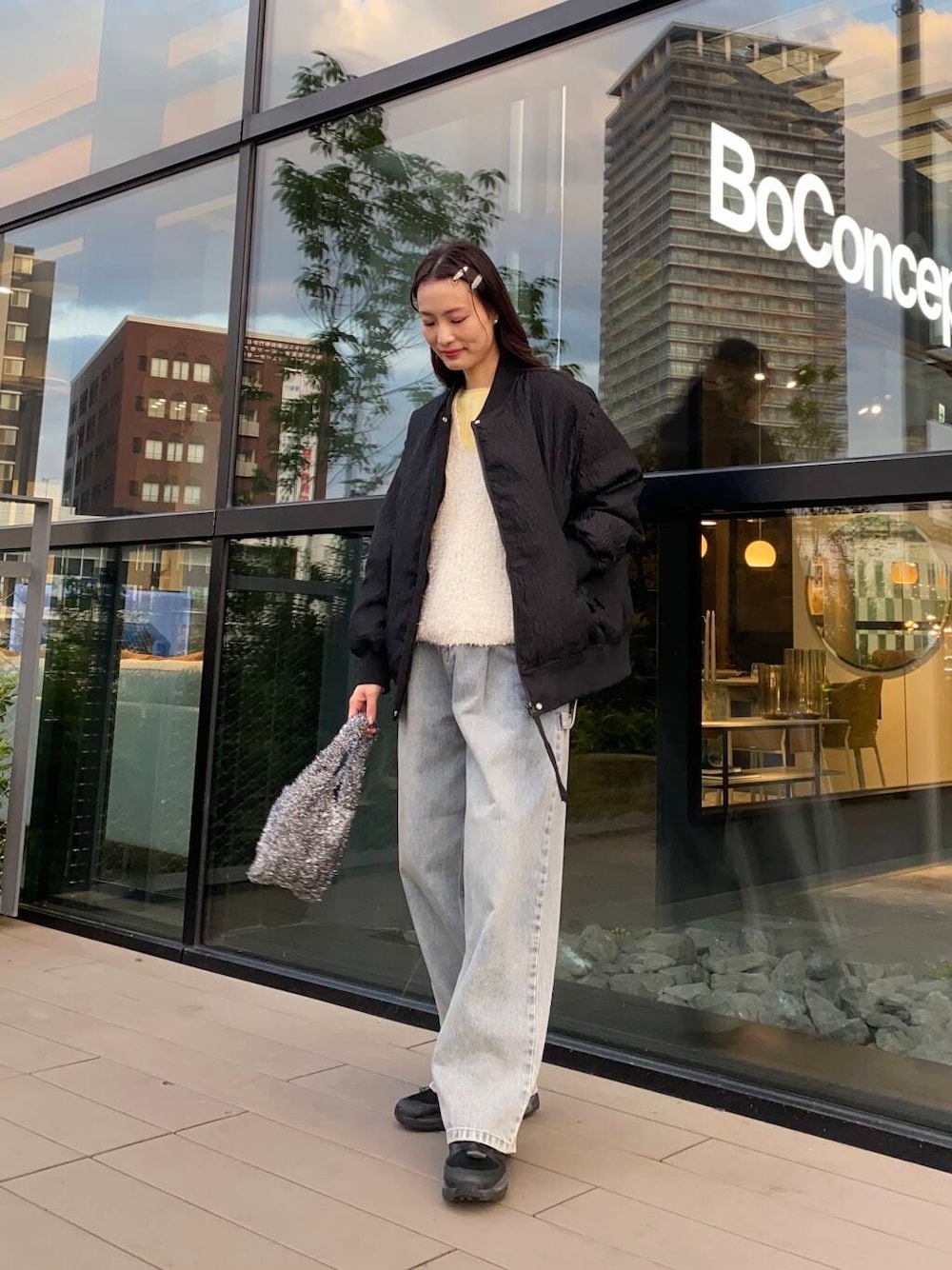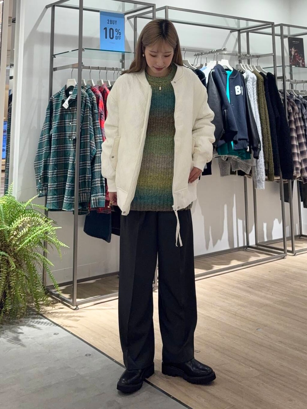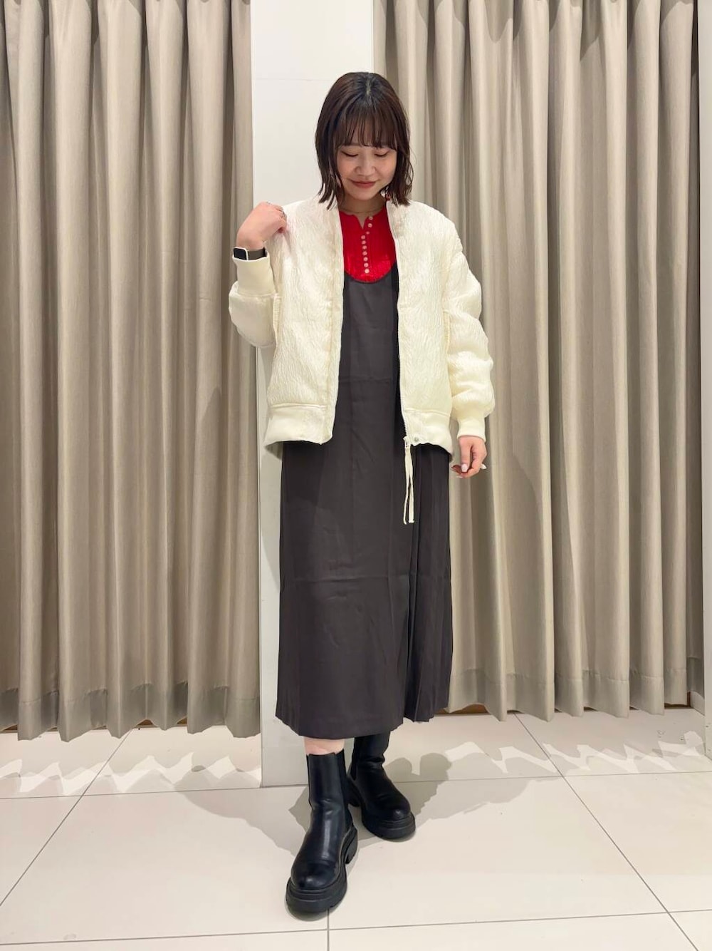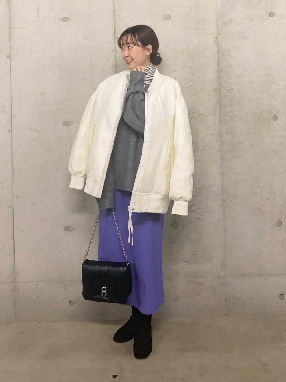 機能性のある中綿素材を使用したMAー1。表面感のあるジャガード素材がポイントです。コンパクトなニット+スカートにばさっと合わせるのがおすすめです。