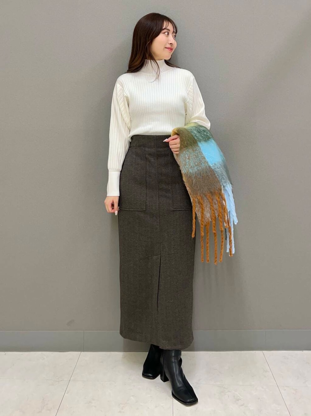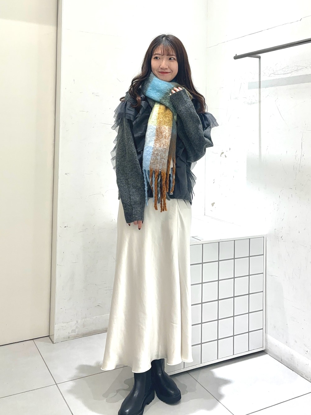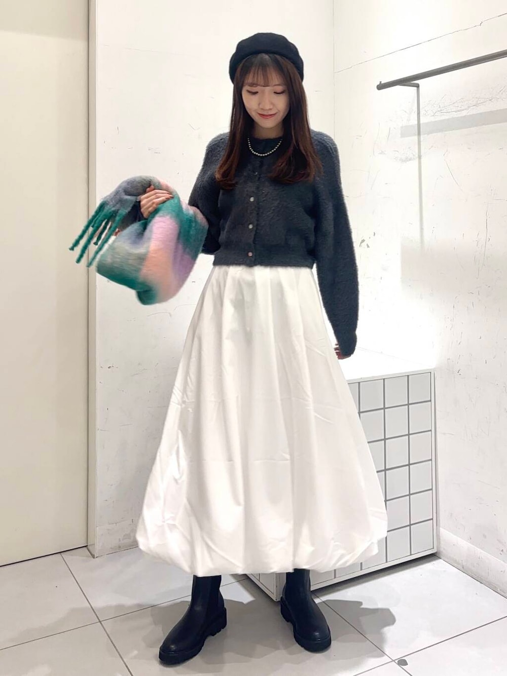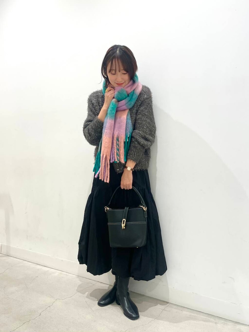 持っておくだけでコーディネート映えするカラー展開×チェック柄はシンプルな洋服やコートなどのアウターとの相性抜群!ボリューム感が今年らしくパンツスタイル合わせはもちろんミニスカート×ロングブーツでかわいらしさを演出するのもおすすめです♪