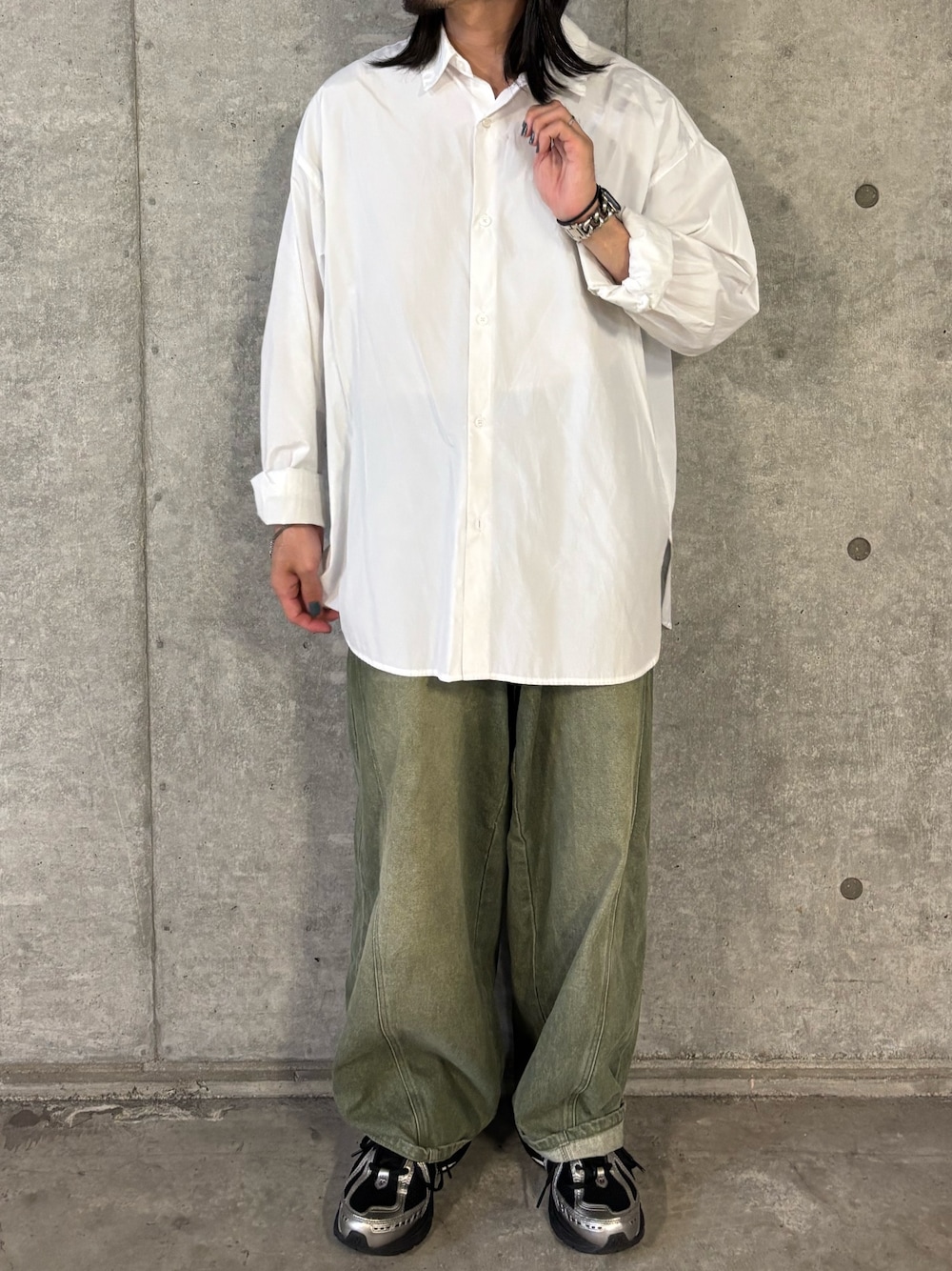 デニムやチノパンツと合わせてカジュアルに、きれいめなスラックスと合わせて大人っぽく、と幅広いスタイルに対応します。ニットやスウェットのインナーとして、襟元や裾を少し見せるレイヤードスタイルもおすすめです。袖をロールアップして手首を見せたり、ボタンを少し開けて抜け感を出したりすることで、こなれた印象に仕上がります。