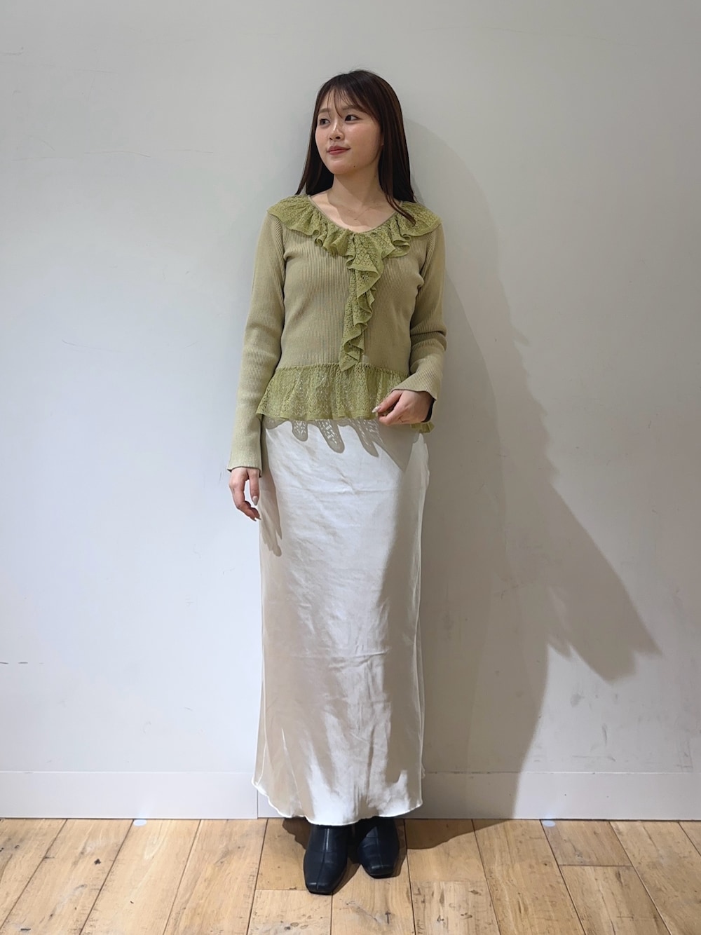 身体のラインを拾いづらい程よい厚みのリブ素材を使用したニットプルオーバー。Vネックラインに沿ってあしらわれた繊細なフリルと、裾のフリル部分が異なる編み地になっており、華やかさと表情を演出します。首元がすっきり見えるので、きれいめな印象で着用可能。ボトムスを選ばず、着回し力抜群の一枚です。