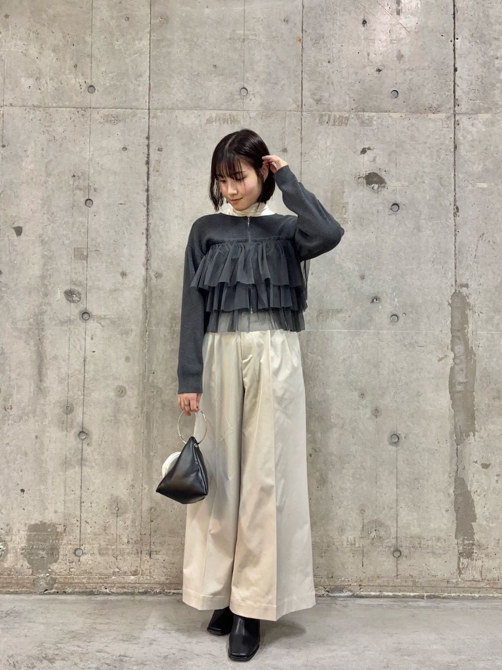 胸元に施されたフリルデザインが目を引くニット。一枚で着るだけで、コーディネートの主役になります。ダブルジップのデザインなので、インナーをちら見せして、ウエスト周りに抜け感を作る着こなしも楽しめます。自宅の洗濯機で洗えるので、お手入れも簡単。