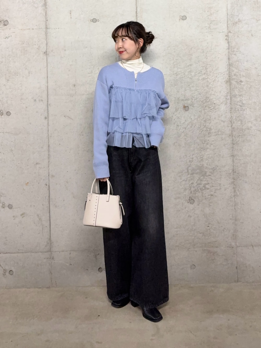 胸元に施されたフリルデザインが目を引くニット。一枚で着るだけで、コーディネートの主役になります。ダブルジップのデザインなので、インナーをちら見せして、ウエスト周りに抜け感を作る着こなしも楽しめます。自宅の洗濯機で洗えるので、お手入れも簡単。