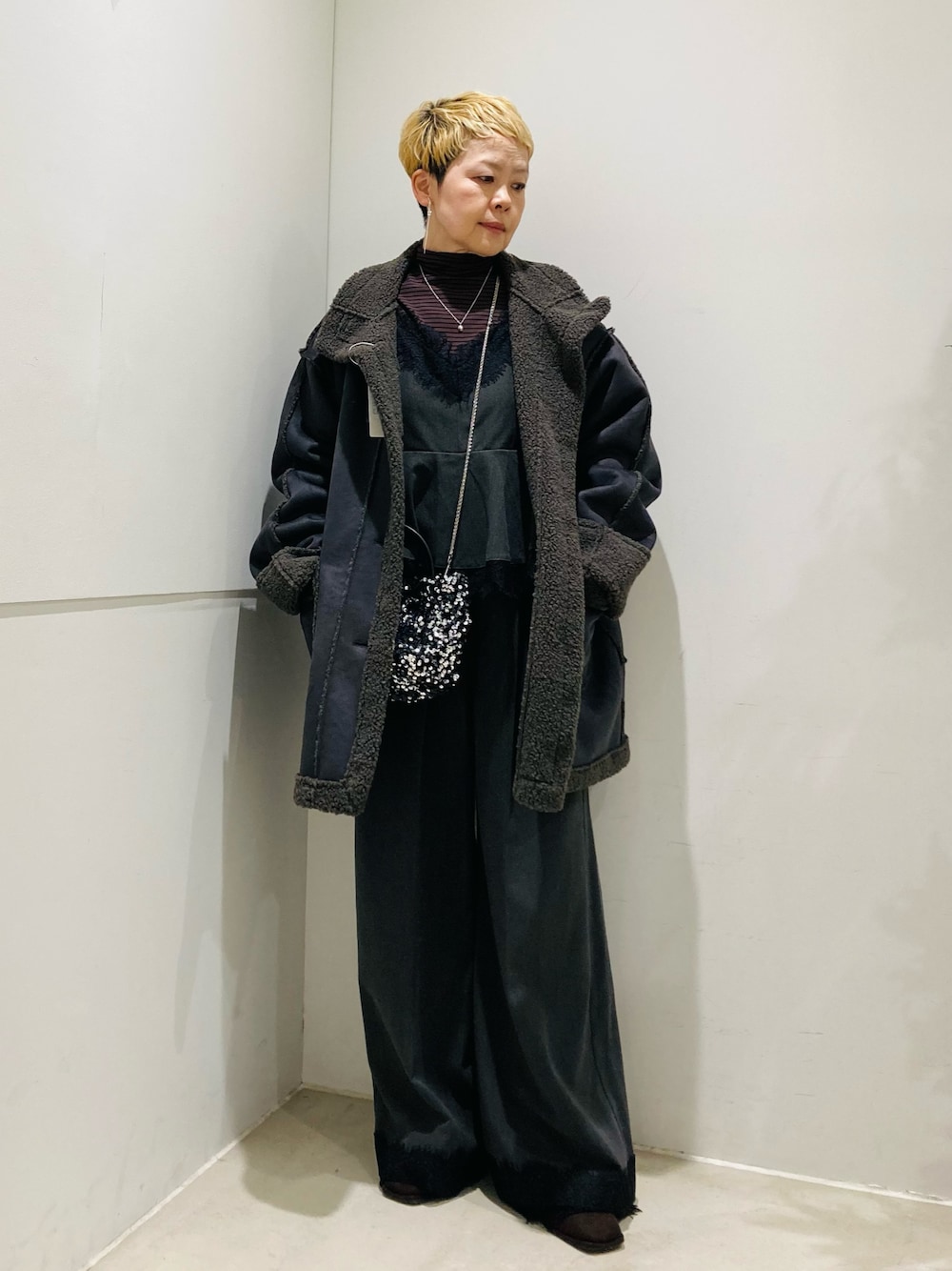 表側は上品なマットスエード調、内側にはふんわりとしたボアをボンディングしたフェイクムートンコート。本格的な防寒性を備えながら、長時間着ても疲れにくいストレスフリーな軽さが魅力です。ゆったりとしたサイジングのミドル丈は、体型カバーを叶えつつ、厚手のニットの上からもさらりと羽織れる万能設計。ボタンを留めてスタンドカラー、折り返してオープンカラーと、その日の気分に合わせて異なる表情を楽しめます。