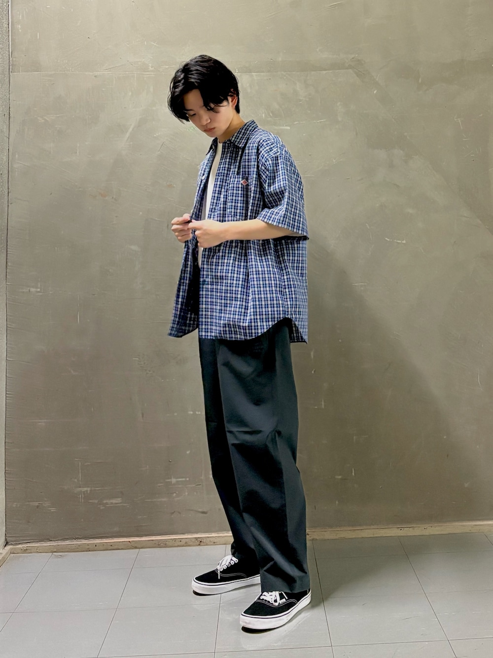 厚みのあるしっかりした生地感で春から初夏のトップスとして一枚で頼りになる仕上がりです。ボックス気味のシルエットで肩まわりに余裕があり、シャツや薄手の羽織りとのレイヤードがしやすいです。