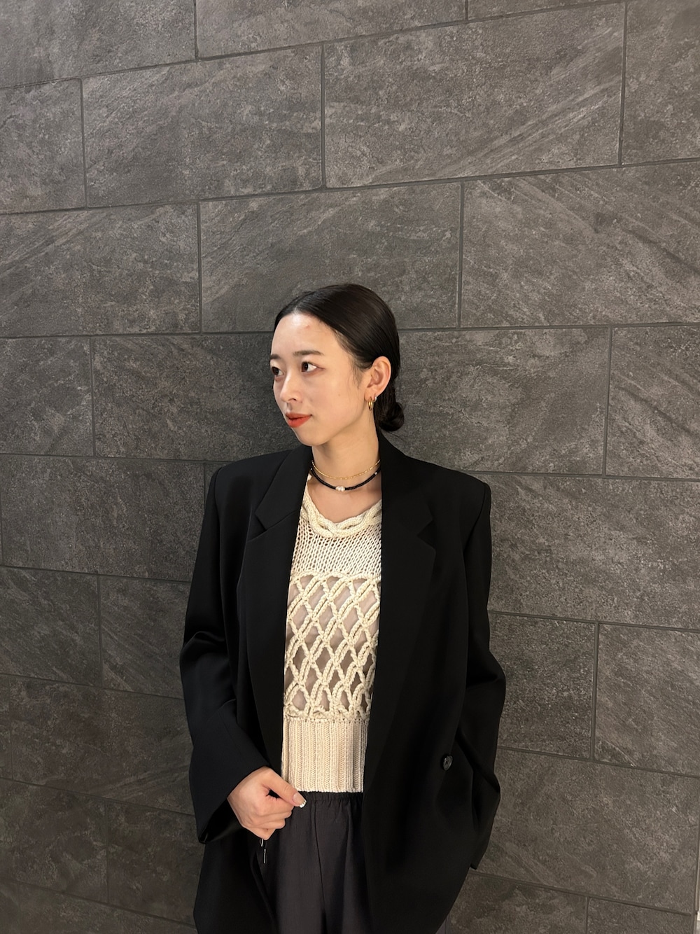 テープヤーンをメッシュ、穴ぼこ、繊細な針抜きの3種類でわけて編み上げパッチワークしたインパクトのあるニットベスト。仕上げに立体感のあるツイストモチーフを縁にあしらい全体のデザインをまとめました。ウエスト部分をしっかりとしたリブで仕上げることでウエストシェイプされスタイルアップ効果も。ノースリーブですが、少し二の腕にかかるくらいのオーバーシルエットにしているのでタンクトップやキャミソールの上から1枚でも美しくご着用いただけます。