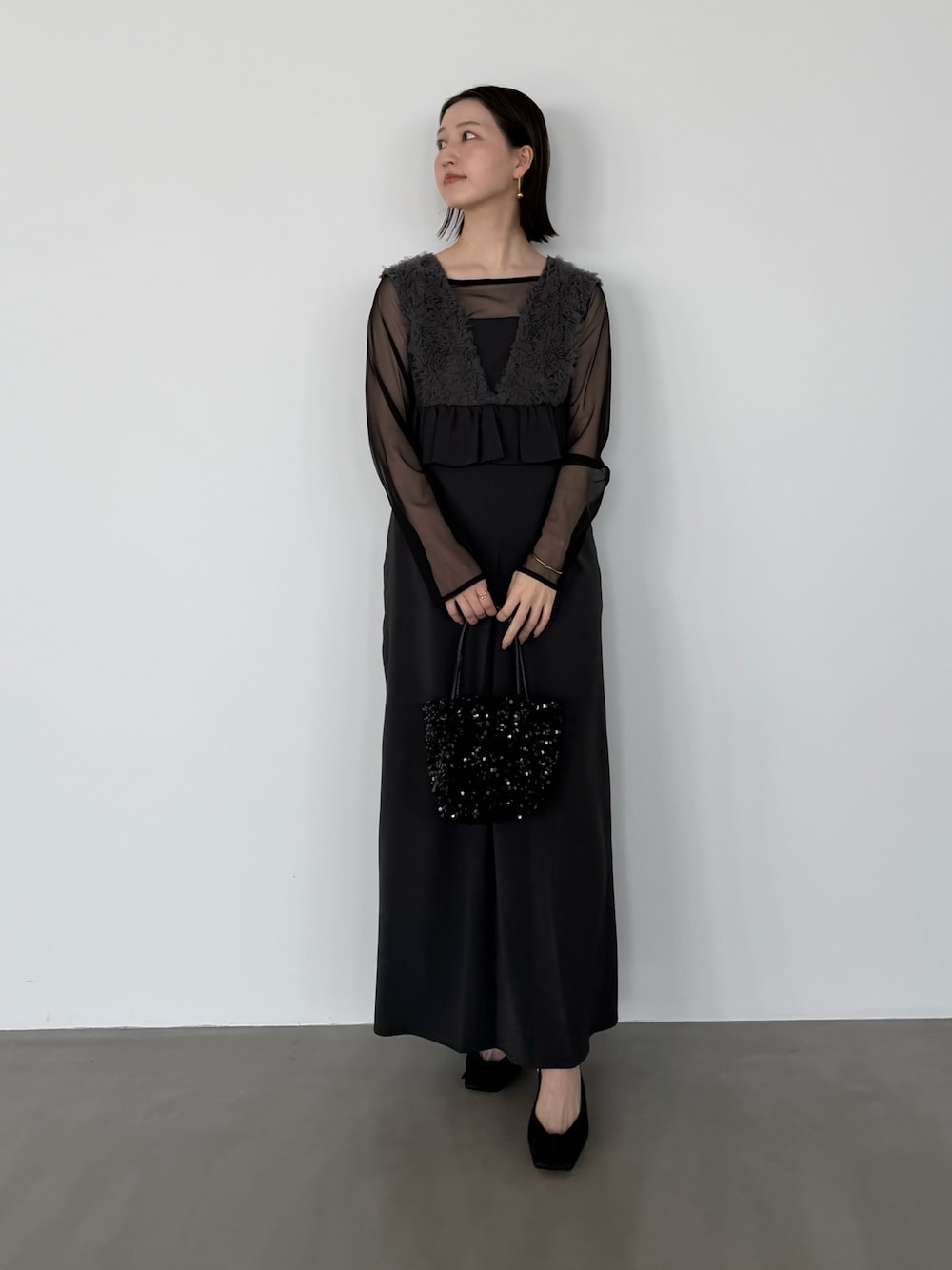 チュールの華やかさと立体感のあるシルエットが魅力のドレスとシアートップスのセットアイテム。デコルテをきれいに見せてくれるVラインのネックで、顔まわりをすっきりとした印象に。トップには立体感のあるモチーフチュールを重ねて華やかに。上半身にボリュームを持たせたデザインは自然とスタイルアップを叶え、ウエストのペプラムでさらにメリハリをプラス。ボディにはほどよくハリのあるダブルクロス素材を使用。体のラインを拾いにくく、すっきりとしたシルエットをキープ。スカート部分のボックスタックがほどよい立体感を演出し、シンプルながらも存在感のある一着に仕上げました。トップスには透け感のあるチュールを取り入れて、抜け感をプラス。異素材の組み合わせが全体にメリハリを与え、モードな印象を引き立てます。