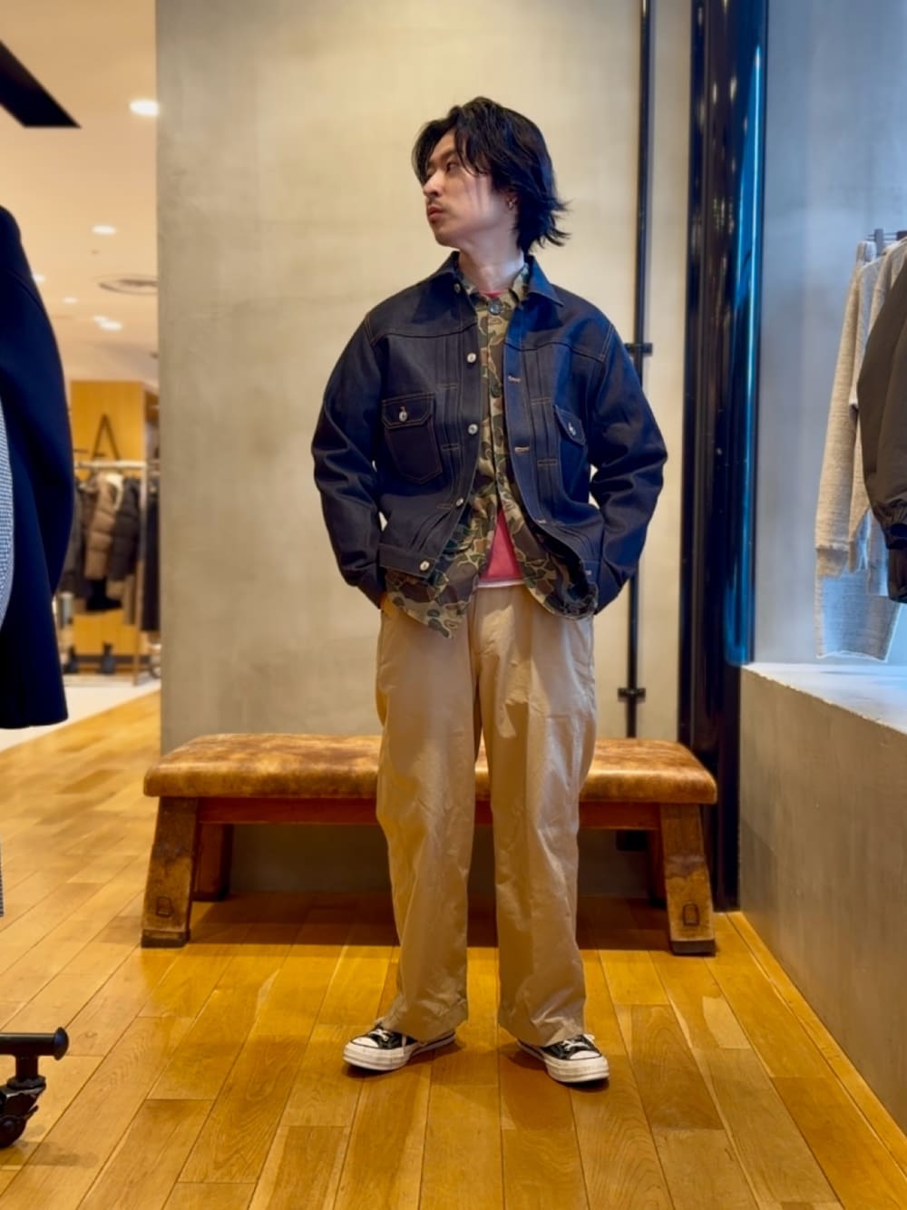 胸ポケットやフラップポケットなどのワーク感あるディテールが程よいアクセントになり、ブーツやレザーシューズと合わせれば大人っぽく、デニムセットアップで合わせれば統一感のある着こなしが作れます。
