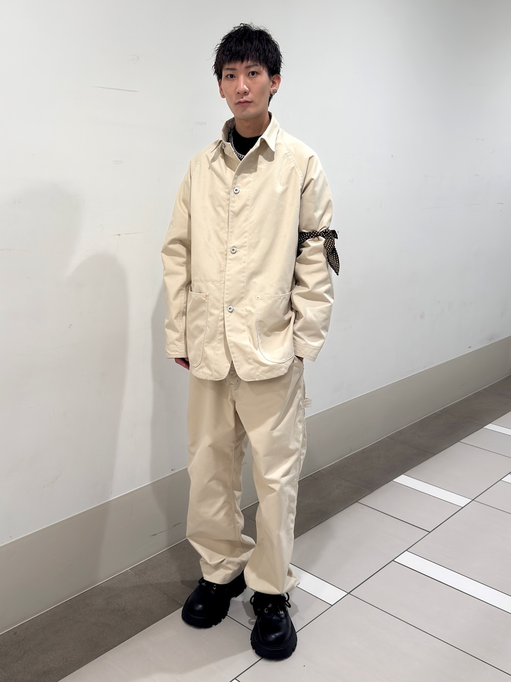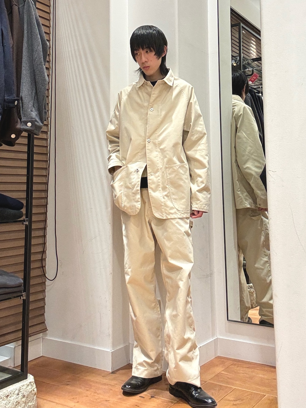 まるでコットンのようなタッチと表情が特徴の「Polyester Duck」素材を使用したカバーオール。