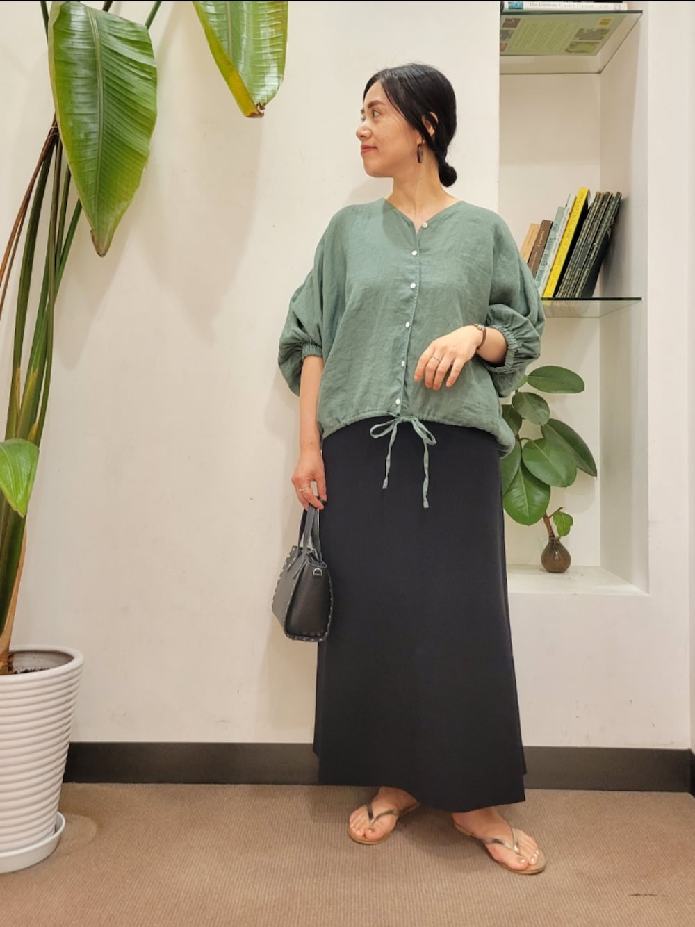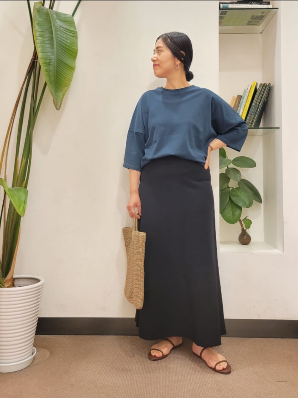 腰回りはすっきりとさせ、裾に向かってセミフレアが入ったシルエットが魅力的で、ブラウスで女性らしく合わせるのはもちろん、ロゴTシャツやボーダーTなどカジュアルな装いにもマッチします。