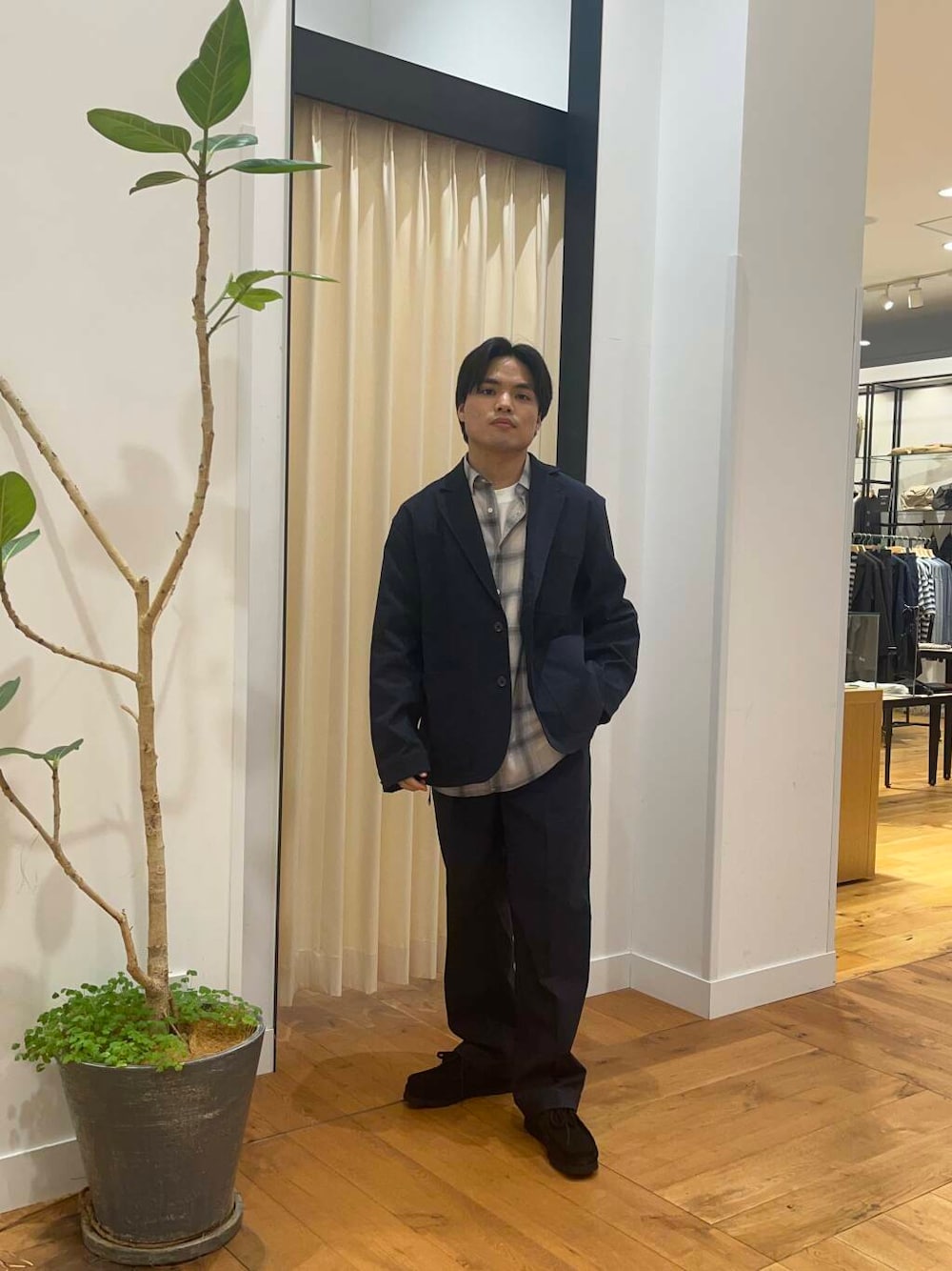 柔らかさと軽さが特徴の細番手のコットンウールブロードを使用し、軽く繊細な糸を使用しているため奥行きのあるチェック柄が完成しました。