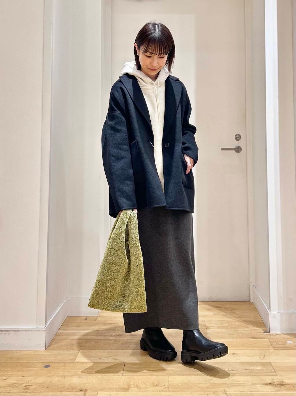 ゆったりとしたリラックス感のあるシルエットを採用し、目の詰んだ編地でしっかりとしたハリがあるのでフォルムはきれいに出ますが、肉厚感はそこまでないのでコートの中にも着やすい1枚です。