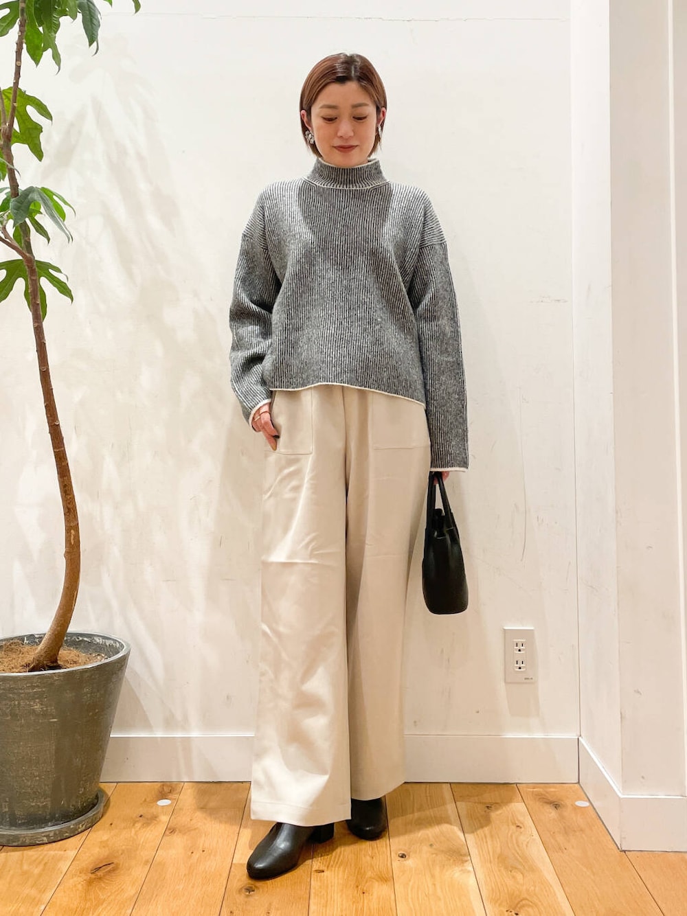 ハイネックデザインがこなれ感と顔周りをすっきりとさせ、着丈を長くしすぎていないのですっきりとワイドパンツやロングスカートにも相性良く着られます。