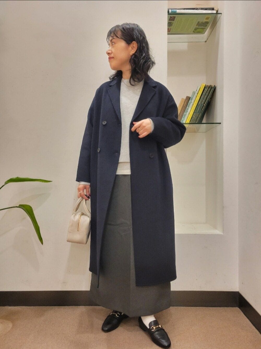 たっぷり着丈長めのコートは着るだけでこなれ感高まること間違い無し。