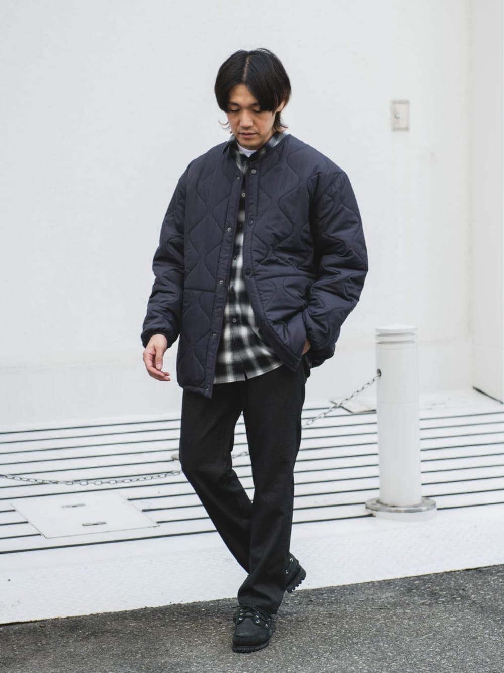 きれいめな素材のアイテムとの相性が抜群で、シルエットは細身~ワイドまで幅広く合わせていただけます。足元はスニーカーを合わせたカジュアルスタイルから革靴を合わせたきれいめスタイルまで合わせられる万能アイテムです。