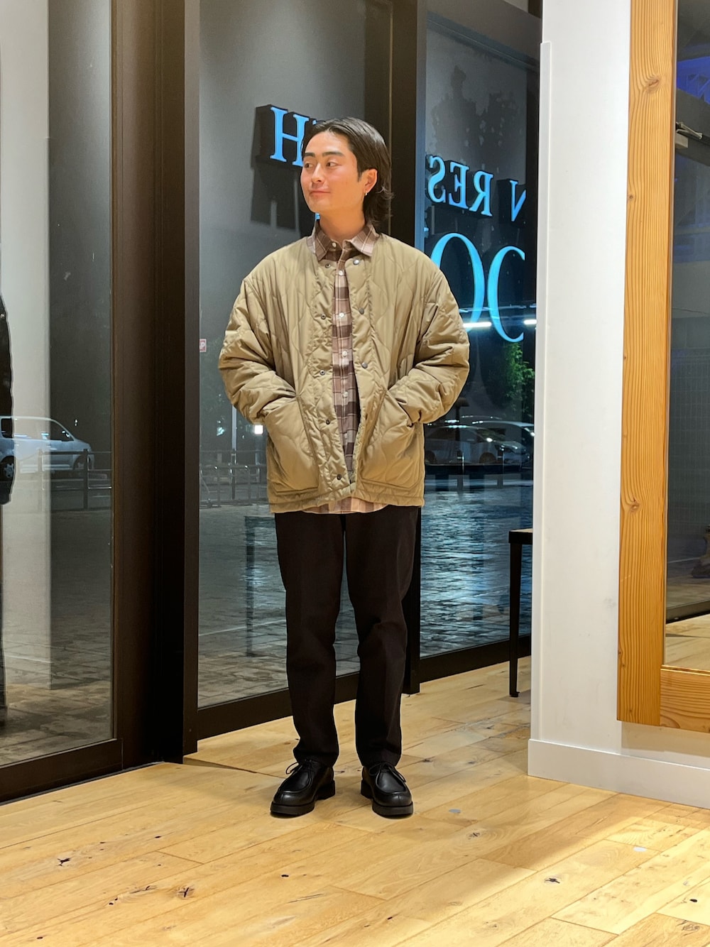 ・きれいめな表情のチノクロス素材でキレイ目からカジュアルなアイテムまで合わせるものを選びません。。