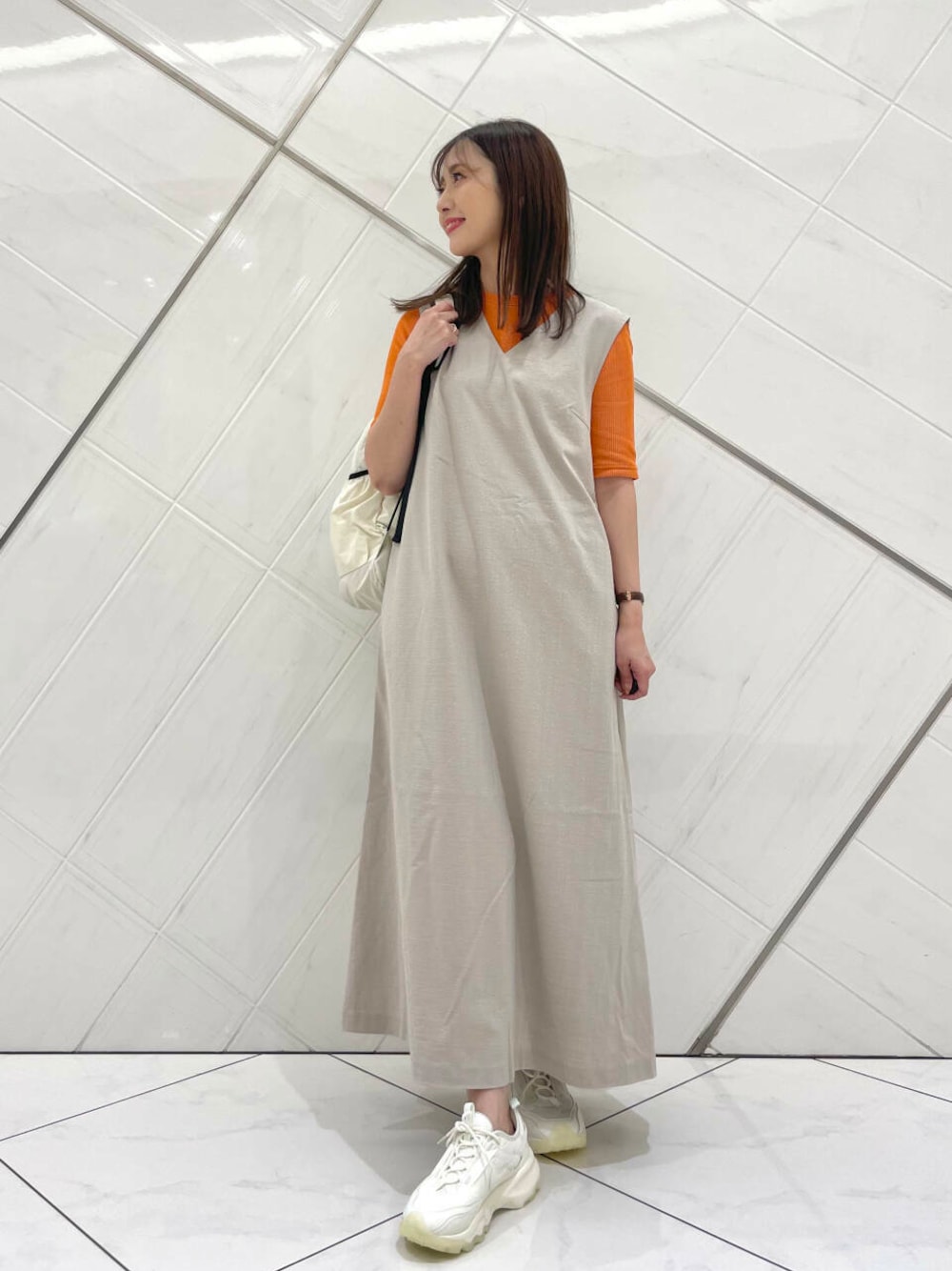 肘にかからない程の5分丈の袖が気になる腕周りをカバーしつつ、女性らしい雰囲気も兼ね備えています。