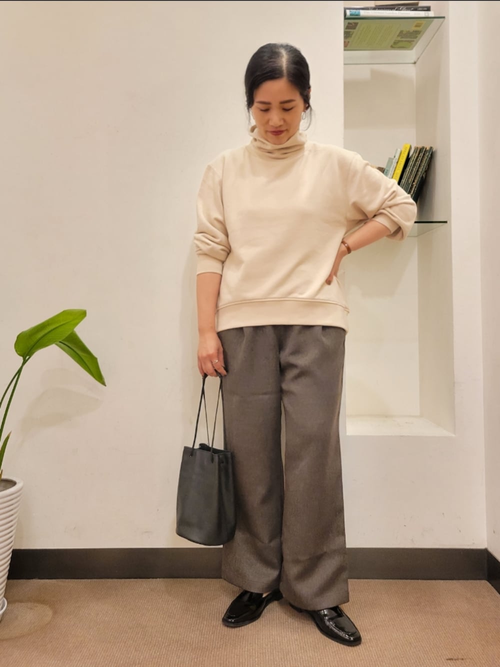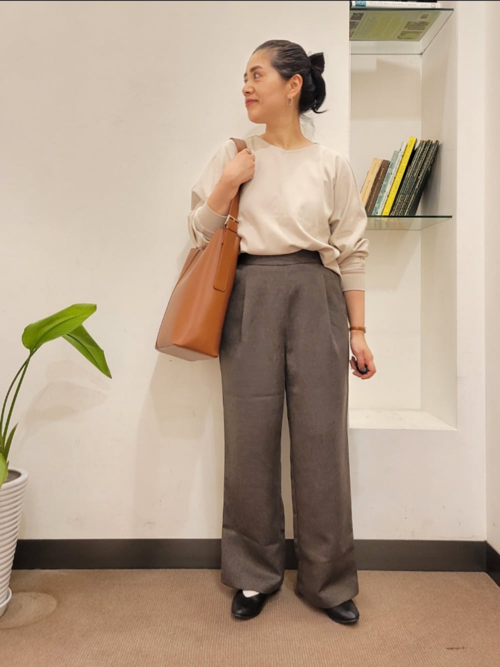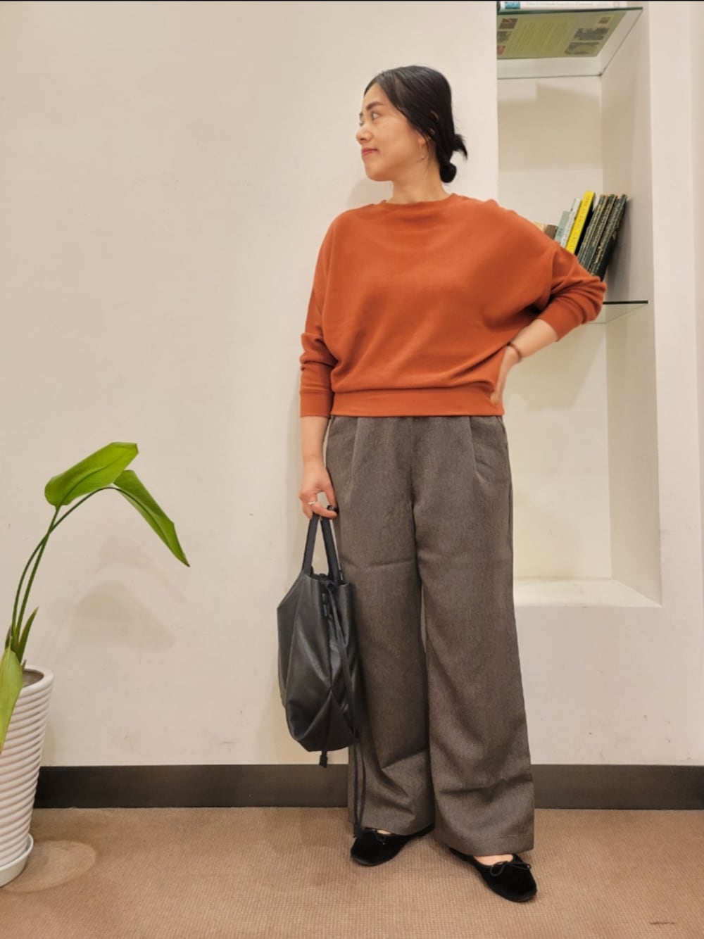 ウエストは後ろのみをゴムで仕立て、穿きやすさと見た目の美しさを兼ね備えました。