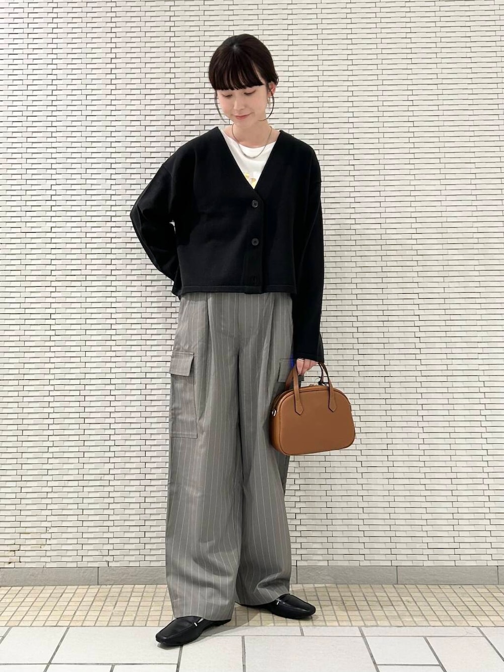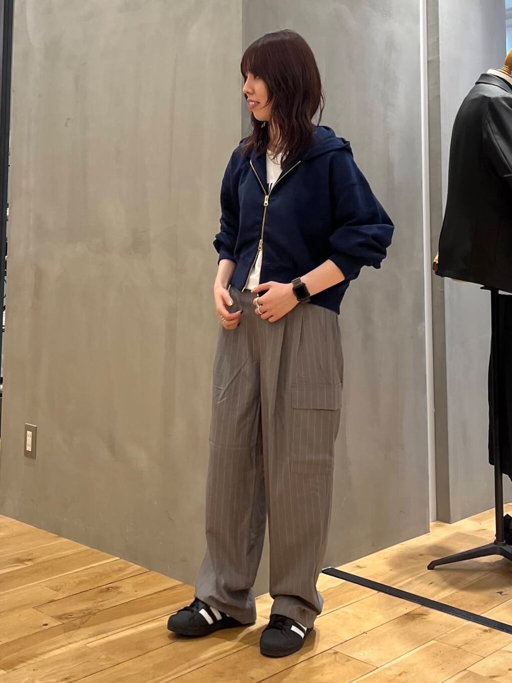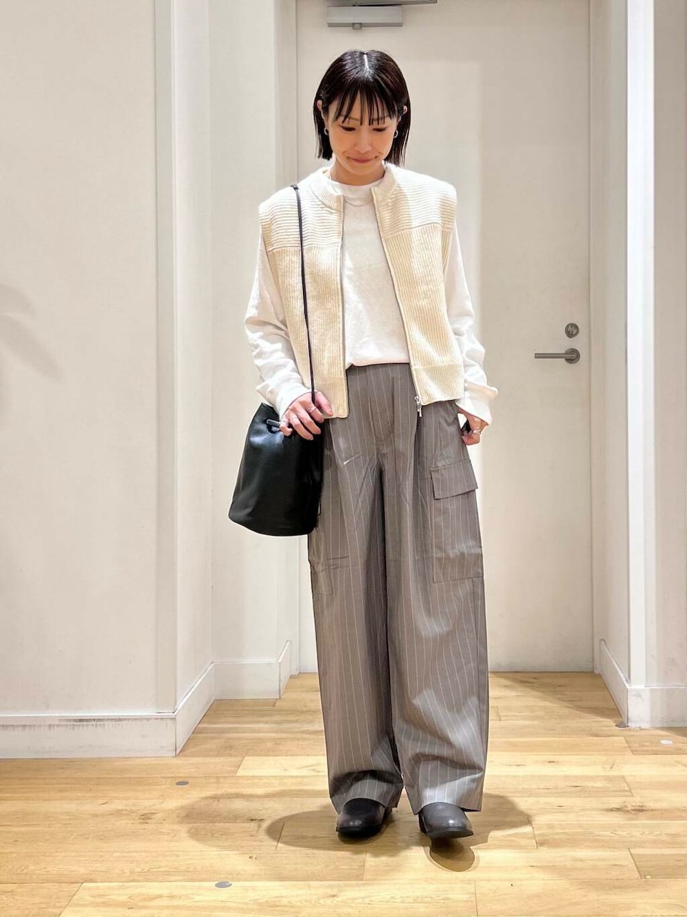 ウエストに入ったタックとストライプでカッチリとした印象ですが、カーゴのデザインが大人カジュアルなスタイルにマッチします。
