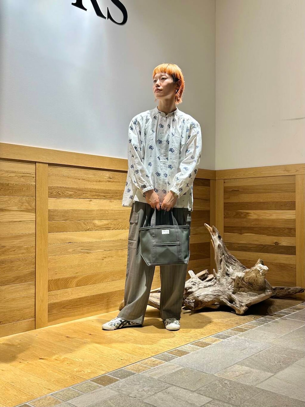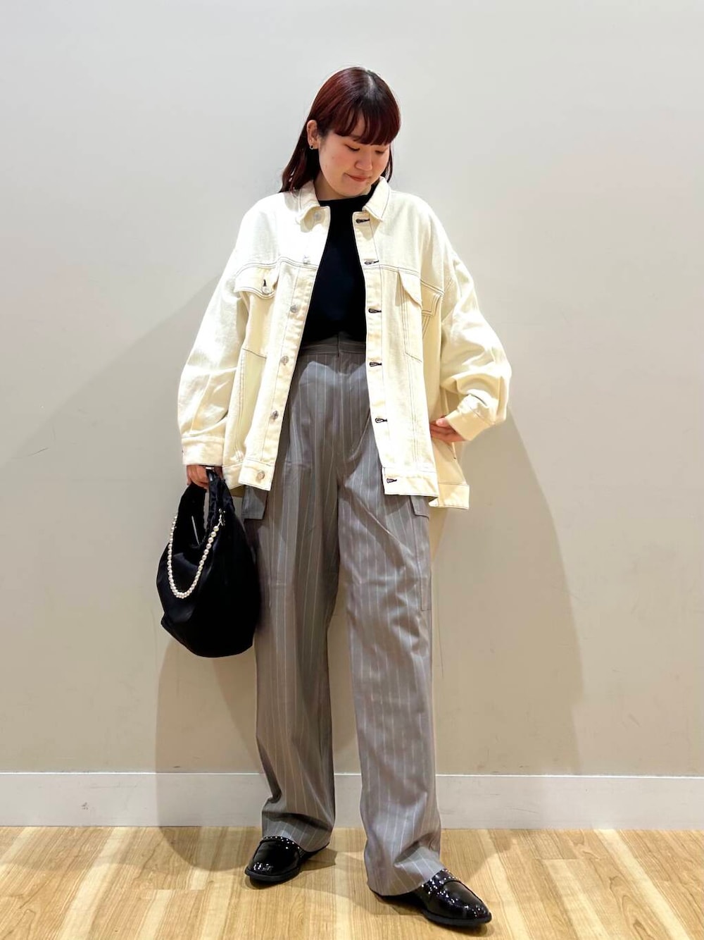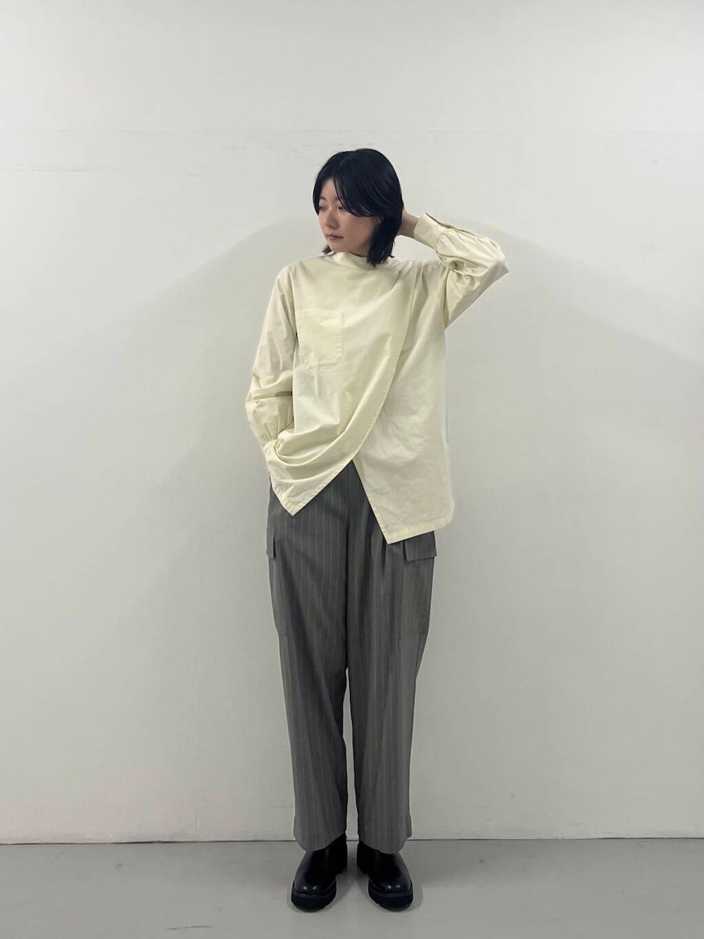 ウエストに入ったタックとストライプでカッチリとした印象ですが、カーゴのデザインが大人カジュアルなスタイルにマッチします。