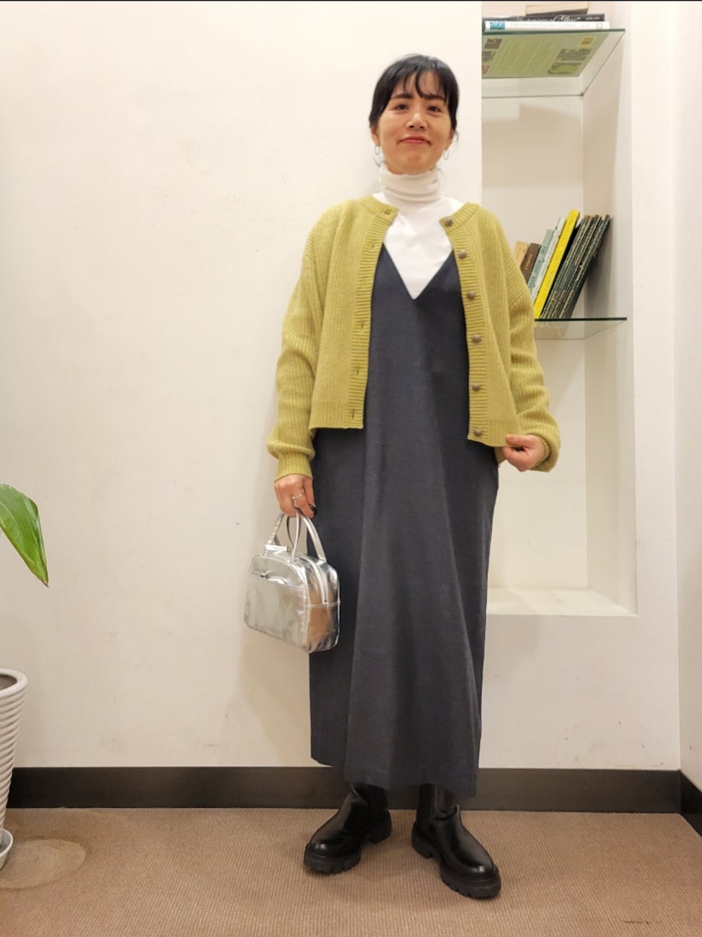 表面感のある畦編みのカーディガンにアンティークシルバーのドット釦をあしらいました。