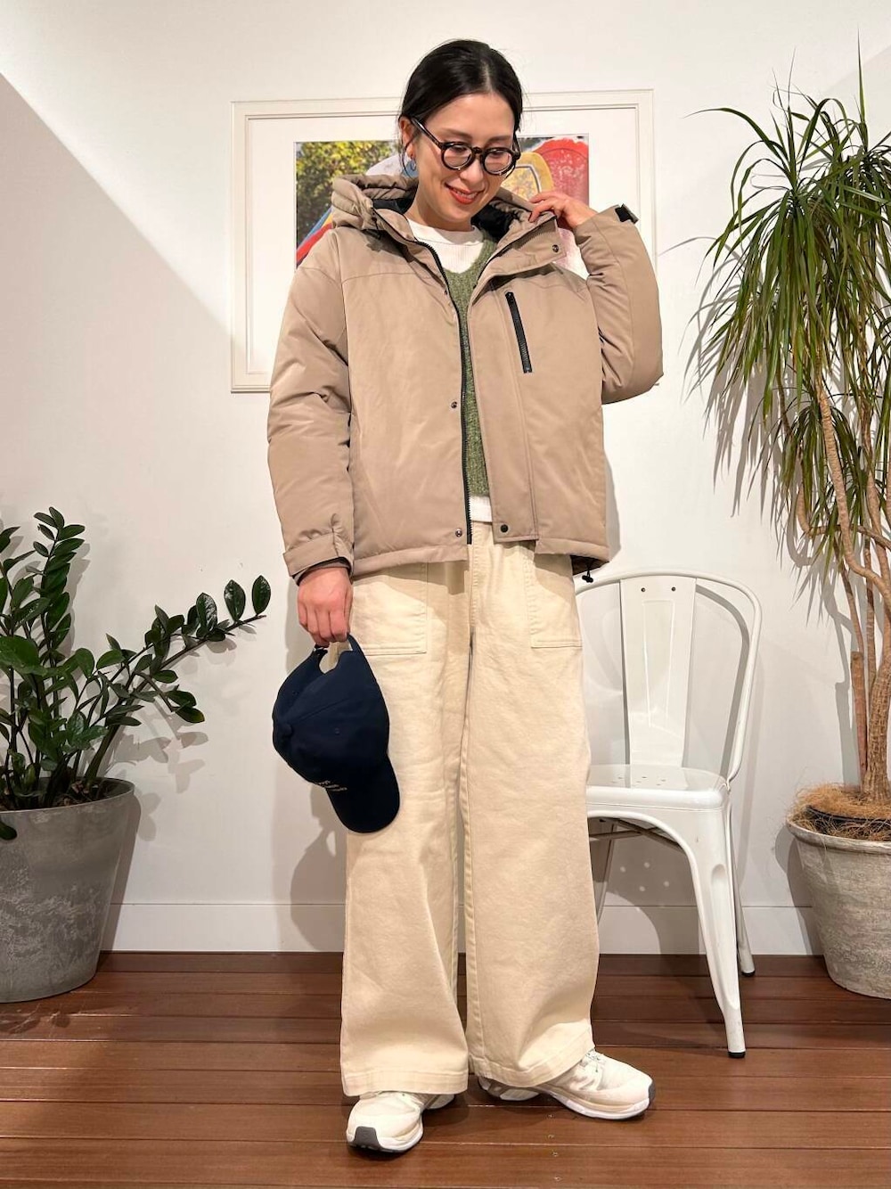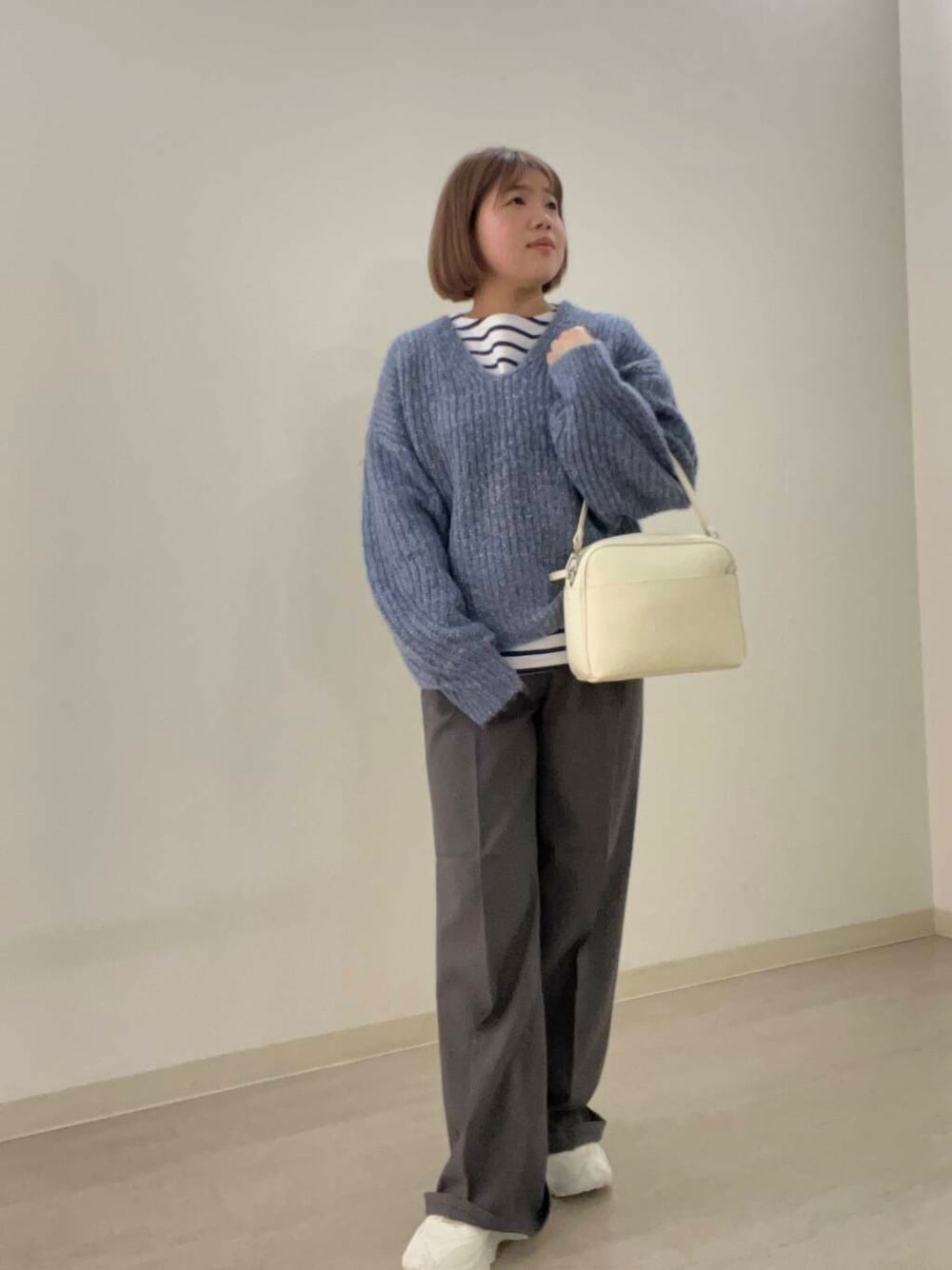 深めに入ったVネックが顔周りをスッキリとさせてくれるので着膨れも解消し、色物ながらも取り入れやすい仕上がりになっています。