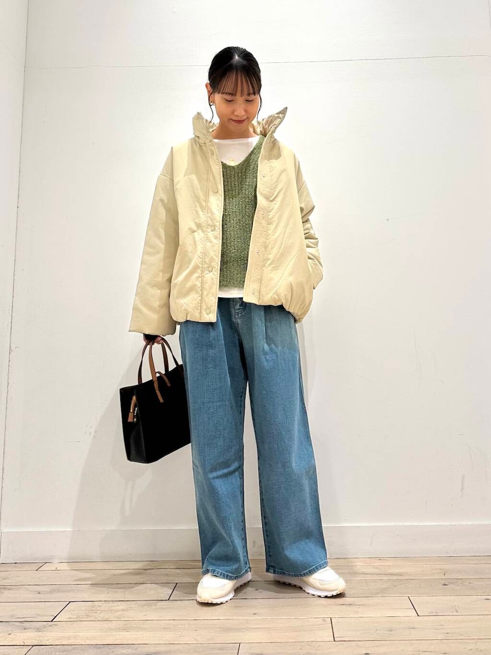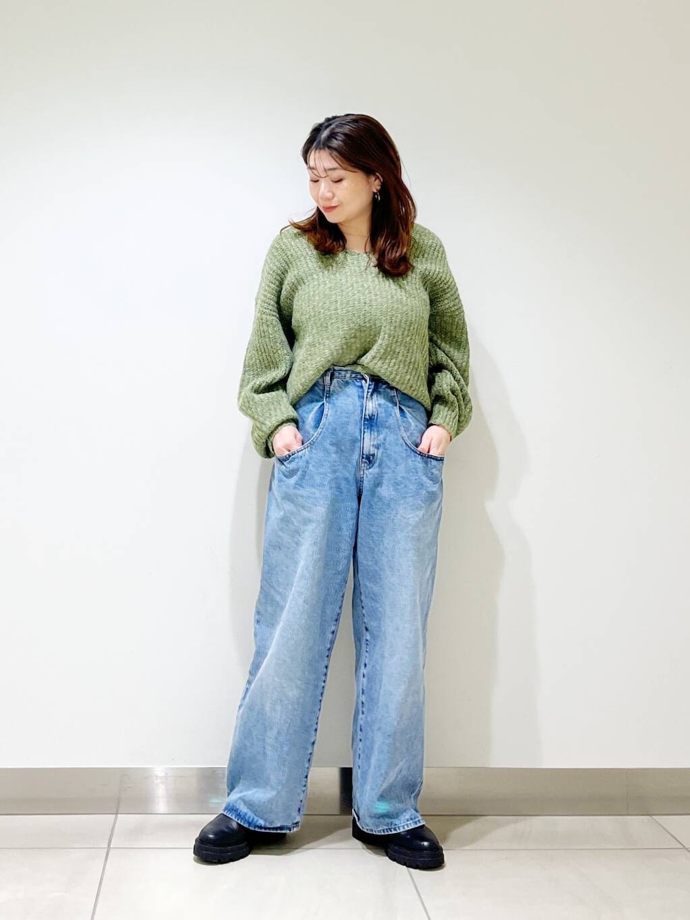 深めに入ったVネックが顔周りをスッキリとさせてくれるので着膨れも解消し、色物ながらも取り入れやすい仕上がりになっています。