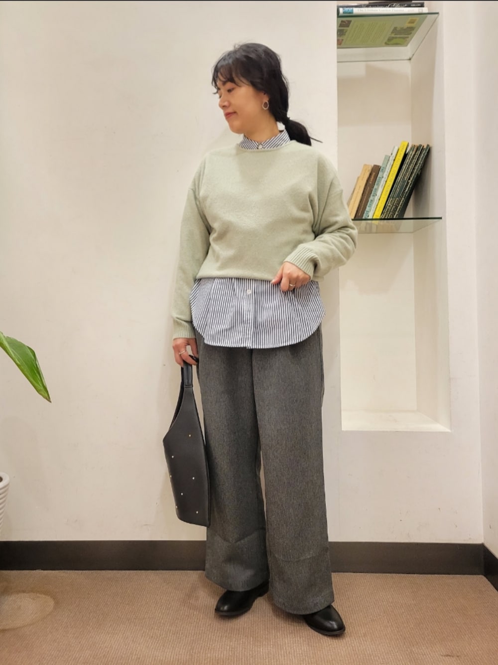 軽い着心地ながらもウール混の糸を使用しているため暖かさも十分で、アウターの中にも重ねていただきやすいデザイン。
