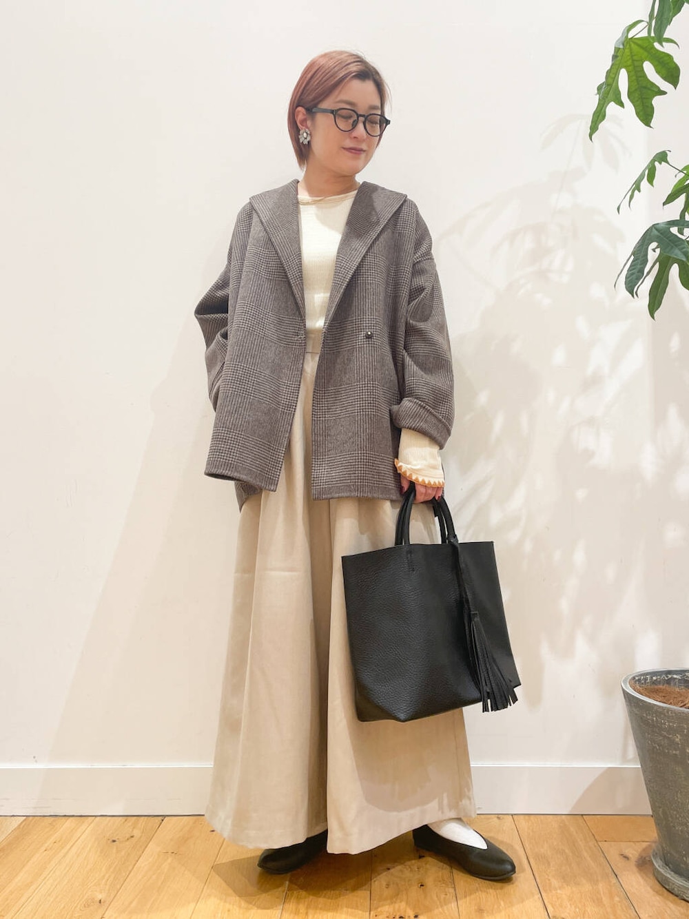 温かみある素材感が特徴のヘリンボーン生地を使用し、ギャザーワイドシルエットのパンツをご用意しました。
