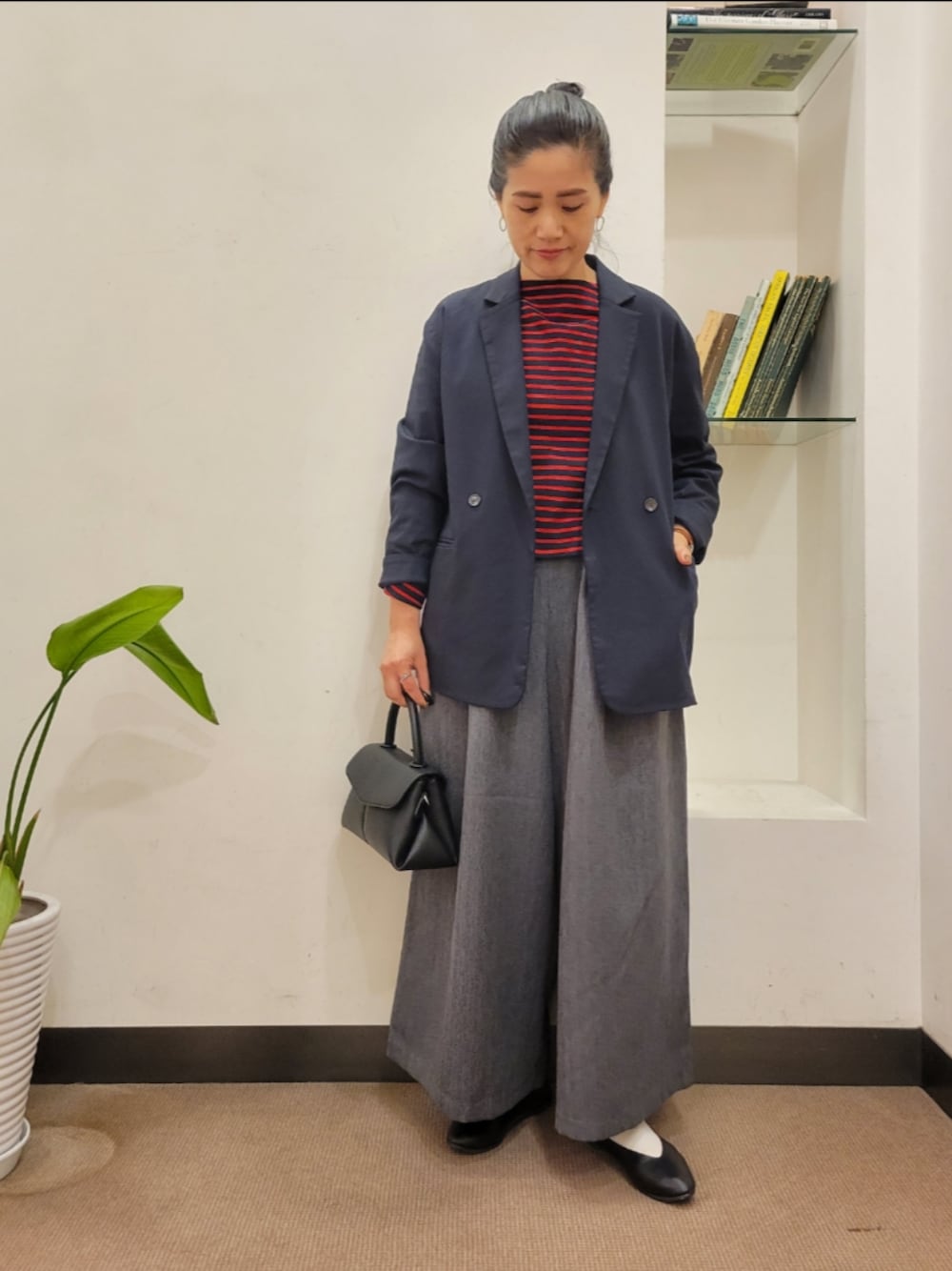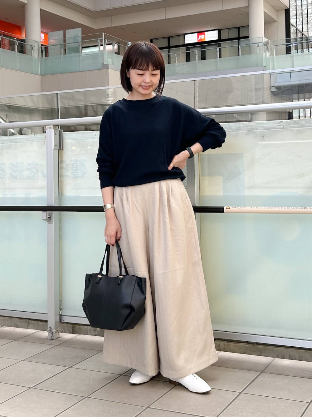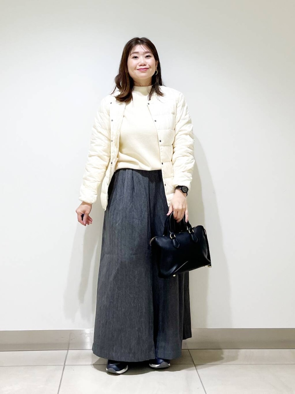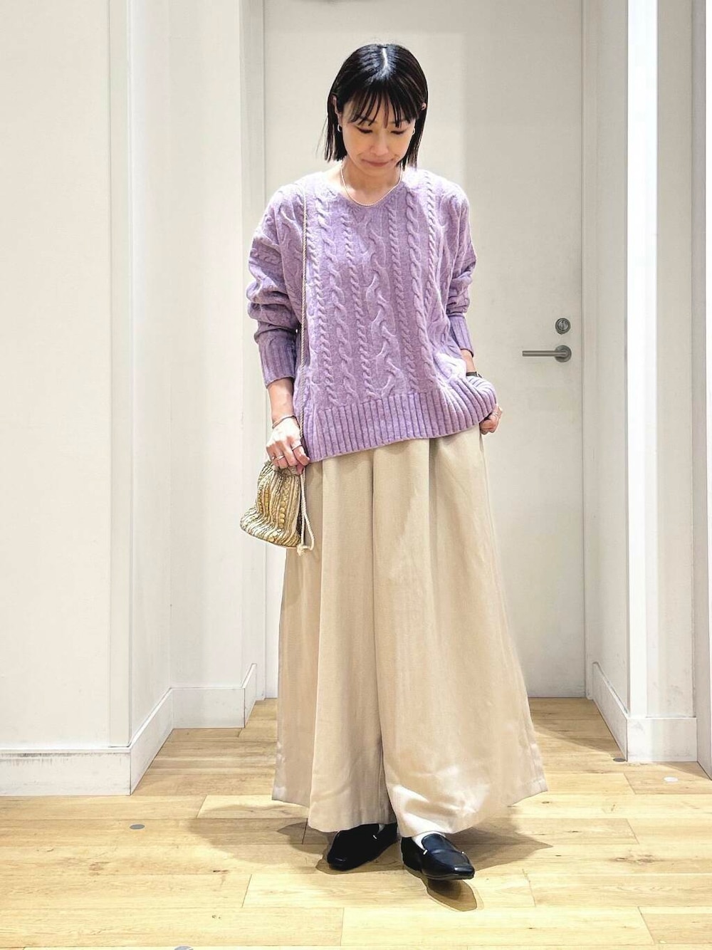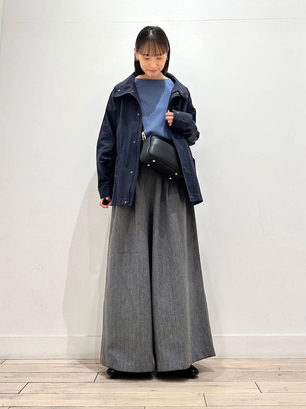 柔らかい生地を使用しているためワイドながらも野暮ったくならず、ニットやアウター合わせにもバランスよく着ていただけるアイテムです。